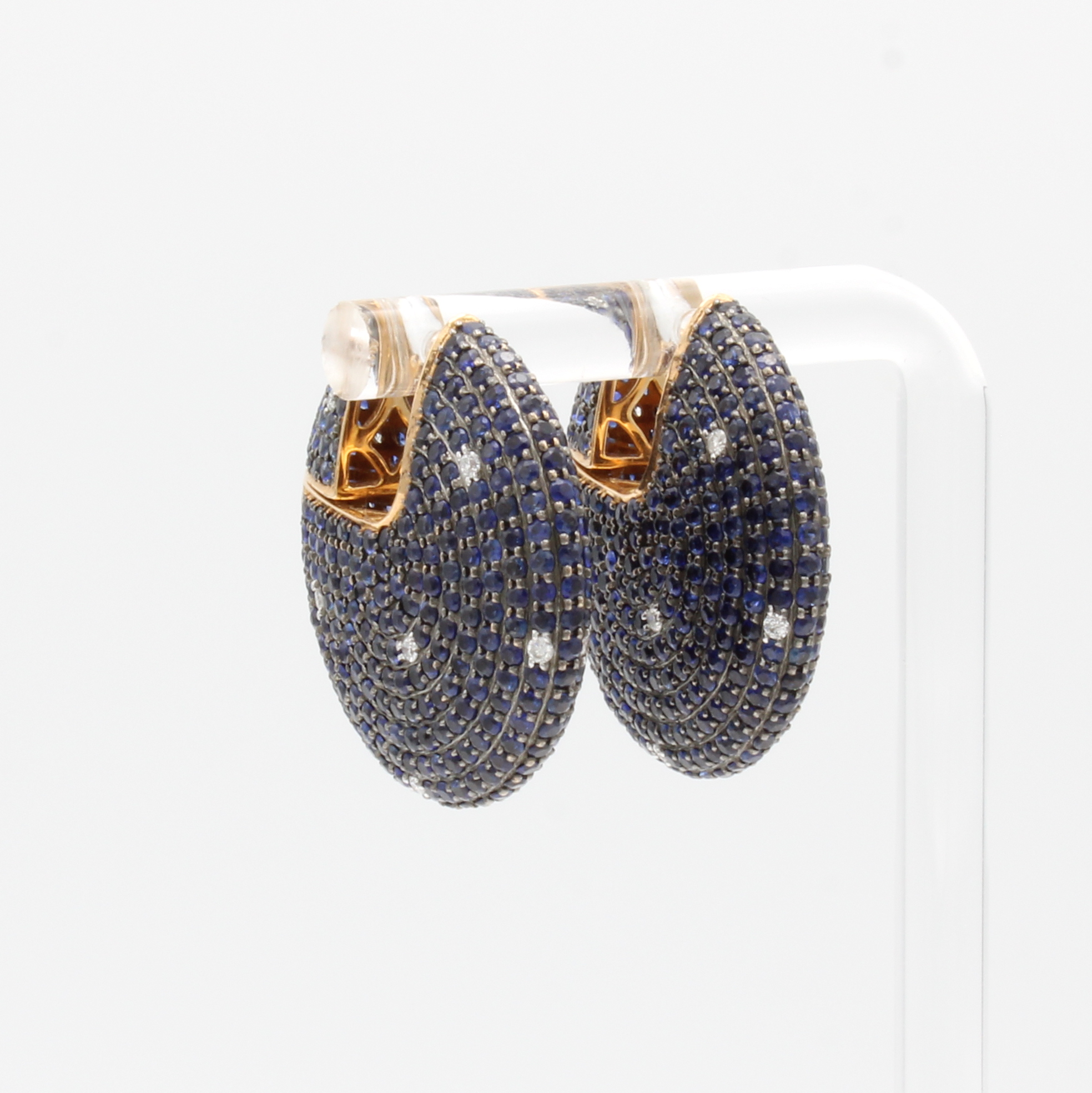 Paar ausgefallen Ohrstecker mit Saphiren und Brillanten, RG 750/000, leicht konvexe, runde Form, Saphire zus. ca. 10.05 ct, Brill. gestreut gef. zus. ca. 0.26 ct Weiß/p, D. ca. 25.5 mm Schätzpreis: 10800, - EUR