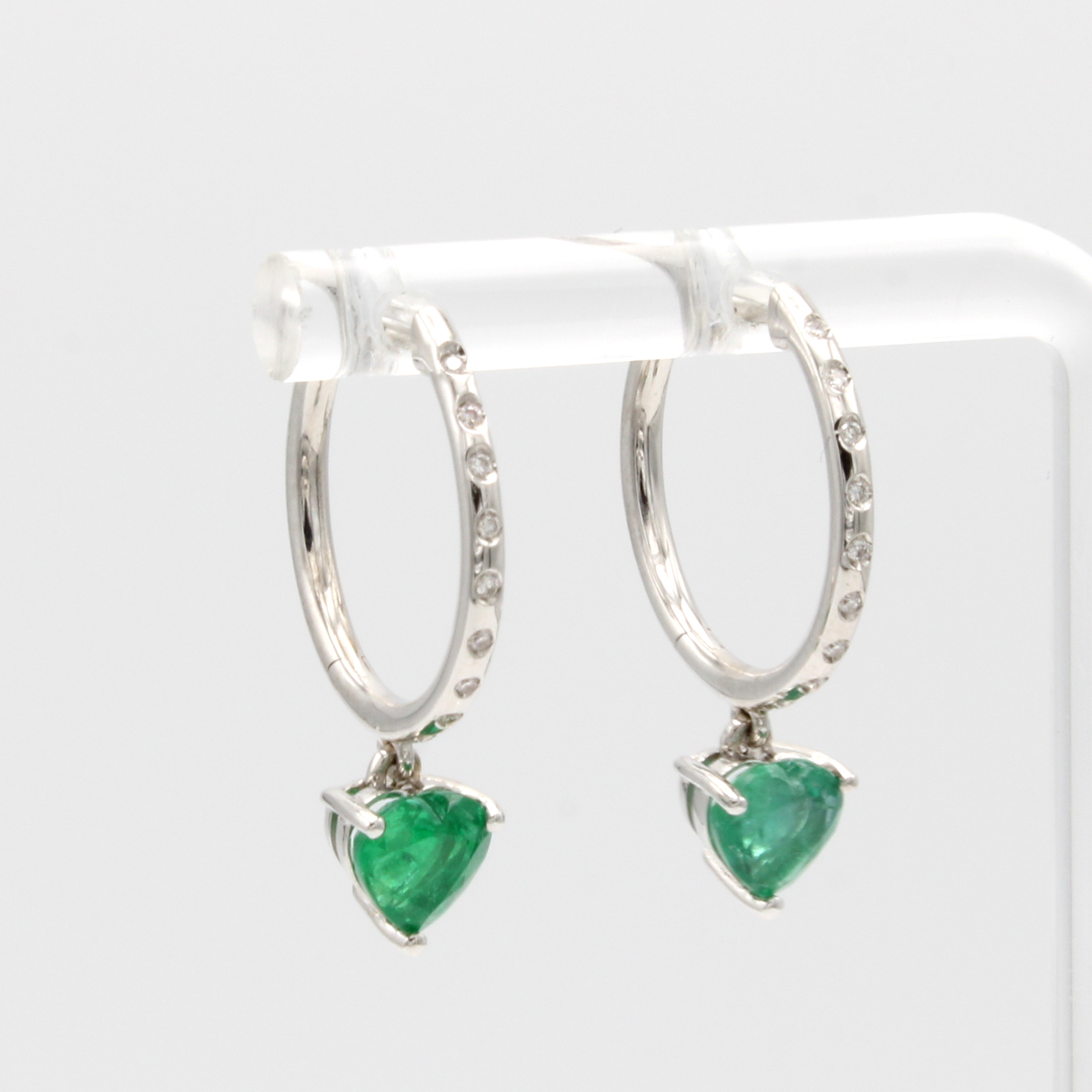 Paar Klappcreolen mit Smaragdabhängungen, WG 750/000, Smaragdherze zus. ca. 1.65 ct, Brill. zus. ca. 0.07 ct Weiß/si, D. ca. 18 mm Schätzpreis: 2800, - EUR