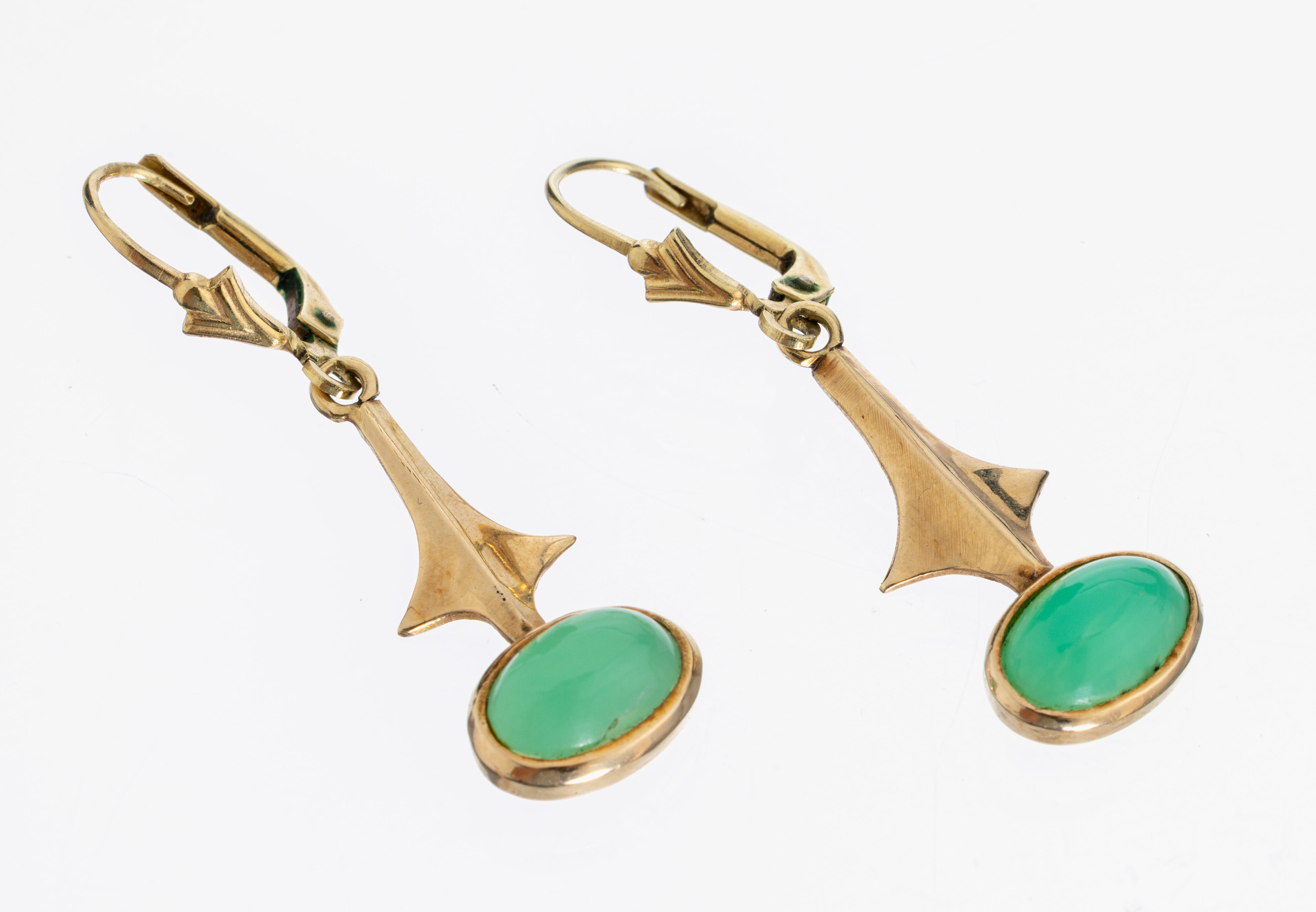 Paar 14 kt Gold Chrysopras-Ohrgehänge, GG 585/000, ovale Chrysoprascabochons, L.