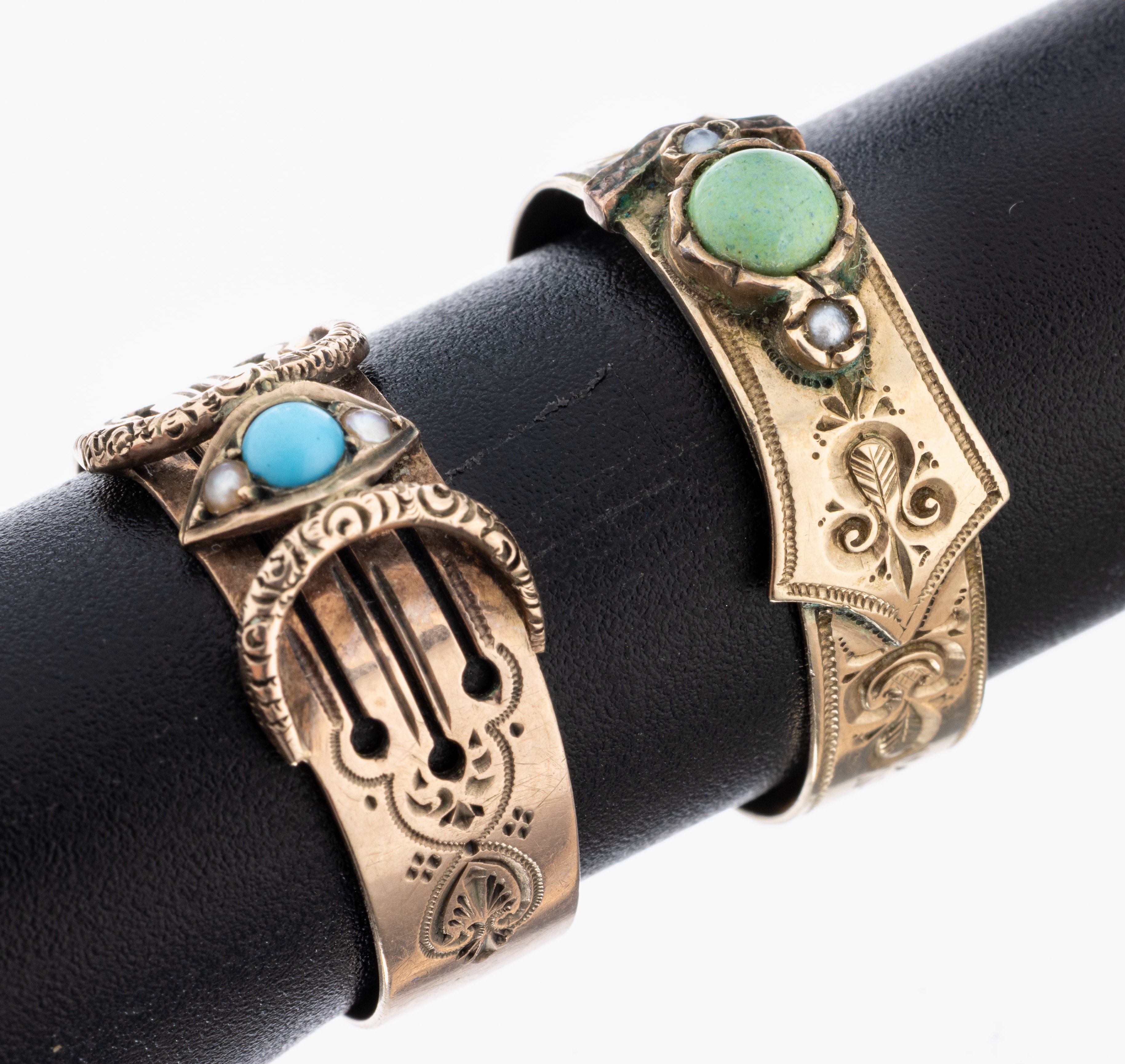 Konvolut 2 8 kt Gold Türkis-Ringe, um 1880, 1 x GG 333/000 mit grünem Türkis-Cabochon,