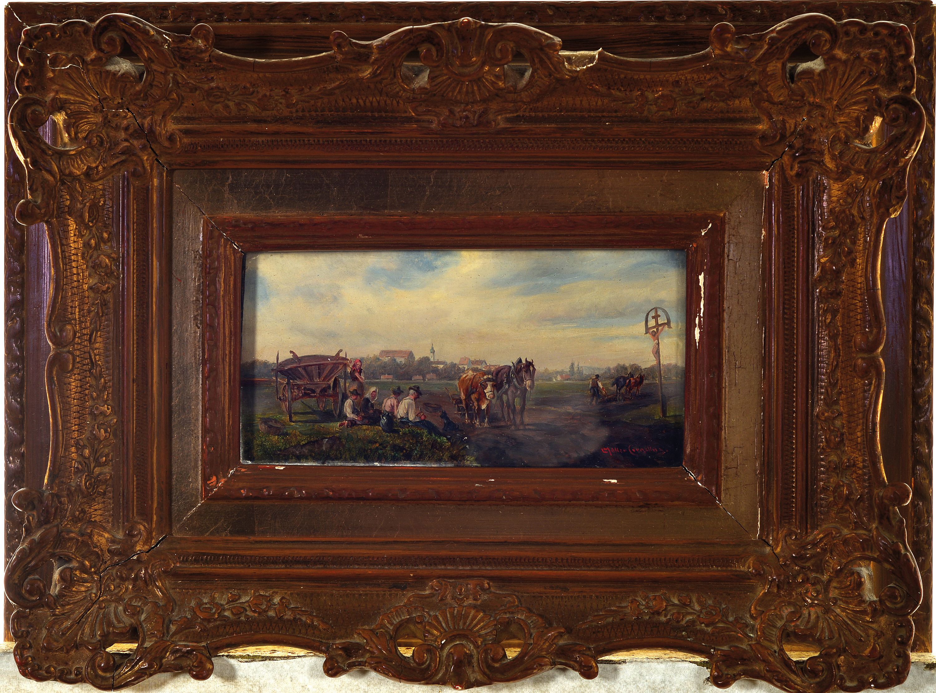 Kartoffelernte in Donauwörth, Juni 1929, Öl/Holz, signiert, ca. 12.5 x 19.5 cm,