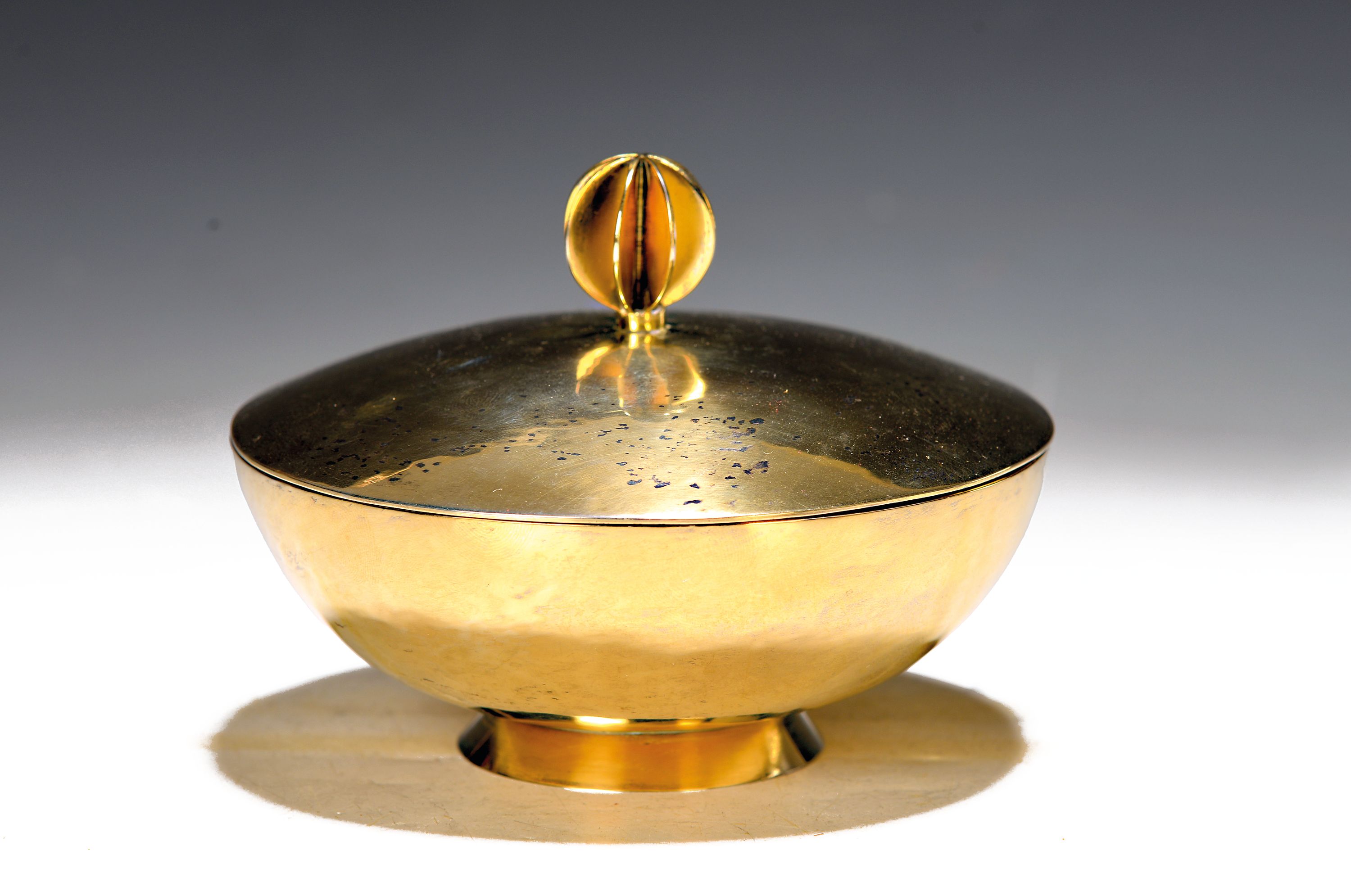 Deckeldose, Mitte 20.Jh., Vermeil-Dose, reine Treibarbeit, vergoldet, aufgefächerter
