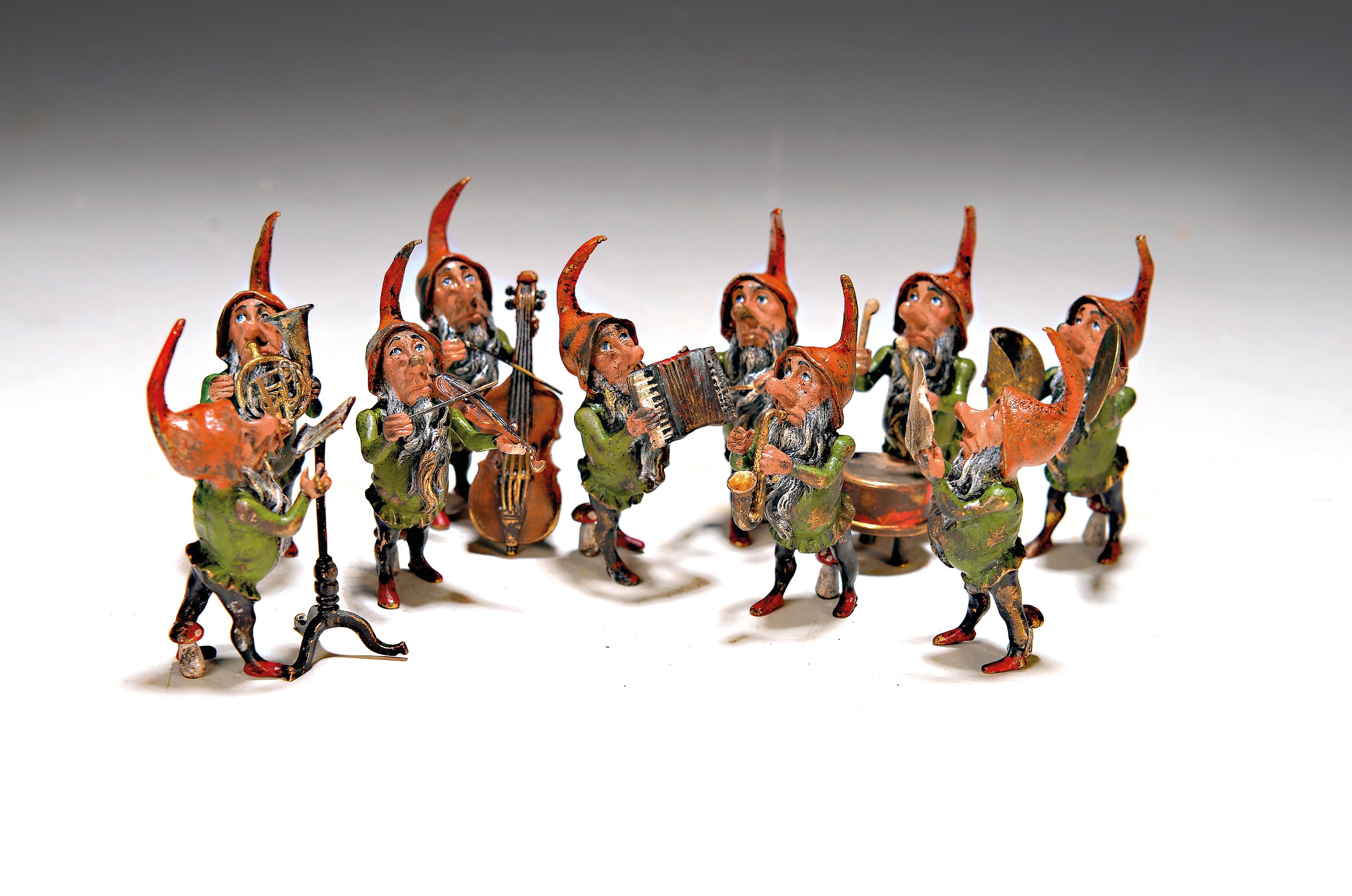 Großes 10-tlg Zwergenorchester, Wiener Bronze, an der Pauke sign. Franz Bergmann,