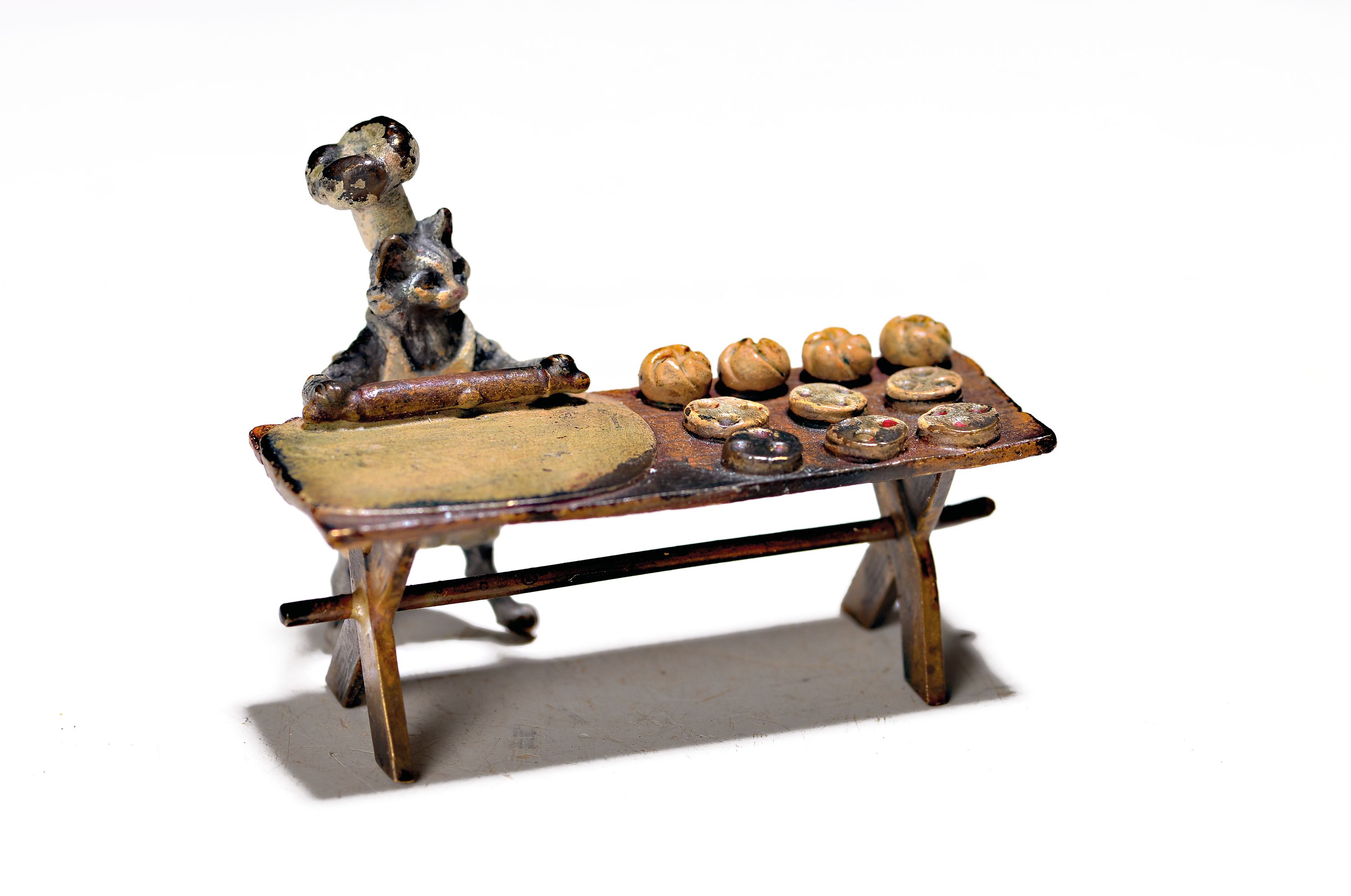 Wiener Bronze, Katze beim ausrollen des Teiges und Teiglingen am Tisch, sign. Wasserkrug,