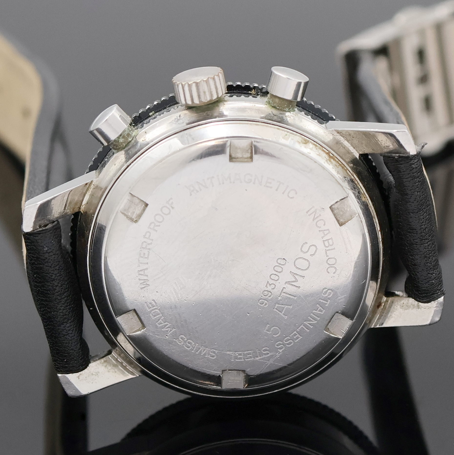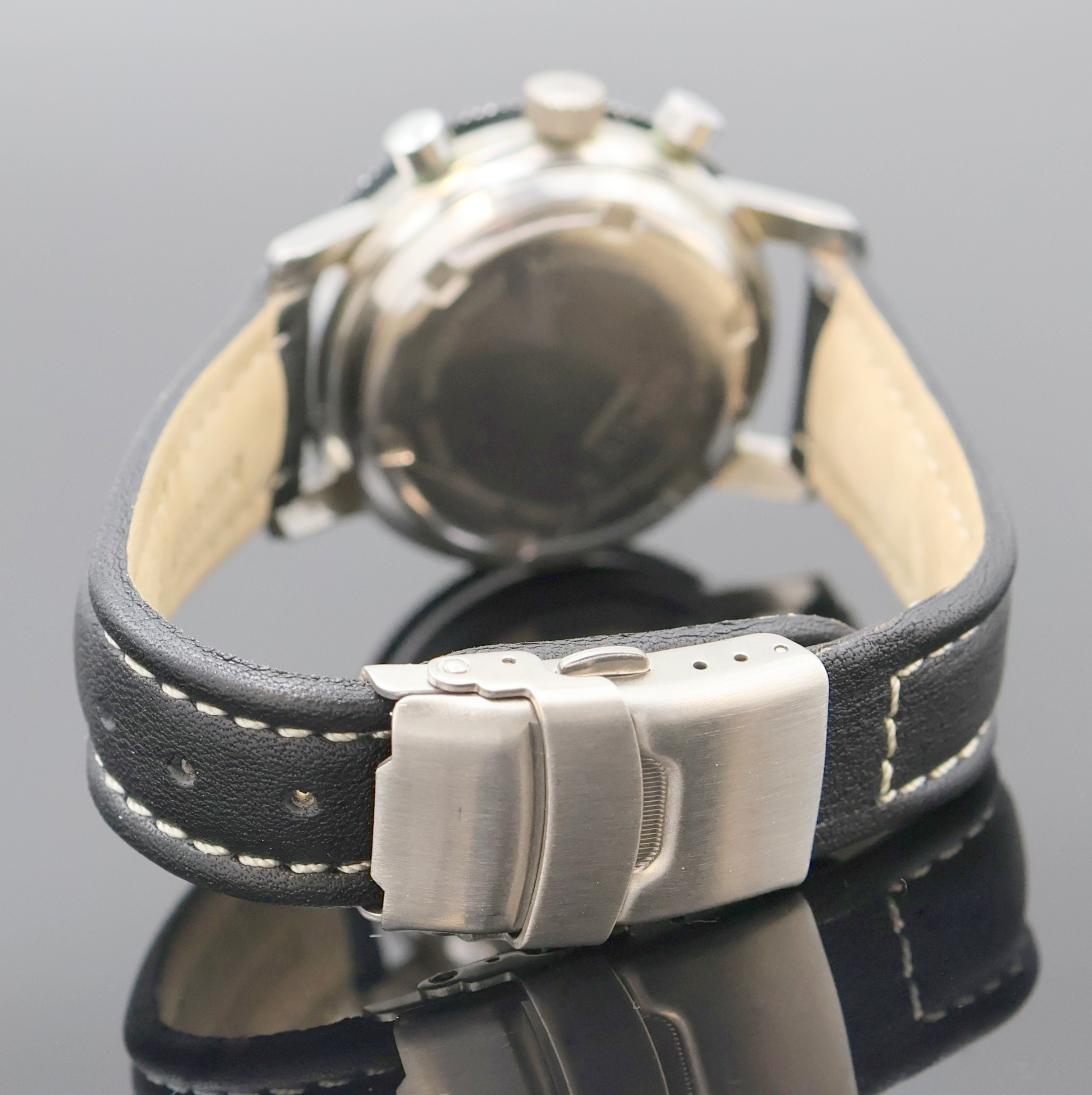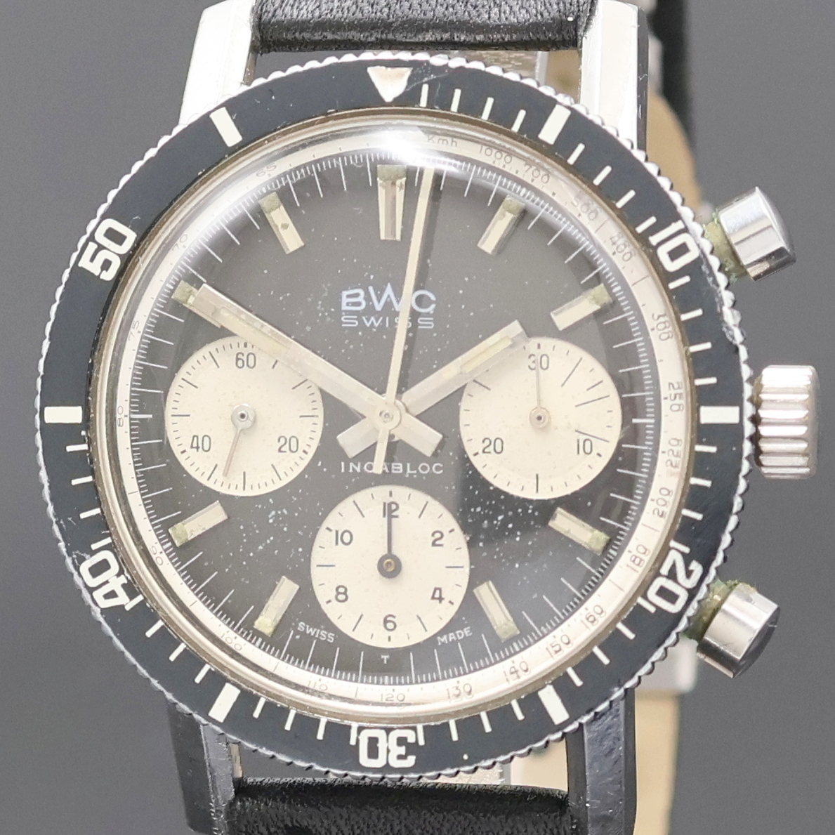 BWC Armbandchronograph in Stahl Referenz 993000, Schweiz um 1975, Handaufzug, Boden verschr., Lederband m. Faltschl., Lünette m. 60er teil. beids. drehbar, schwarzes Zifferbl. pat., silb. Leuchtind., silb. Leuchtzeiger, 30 Min.- u. 12 Std.-Anz., kl. Sek., Kal. Valjoux 72, 17 St., Incabl., D. ca. 38 mm, Überh. empf., EZ 2-3