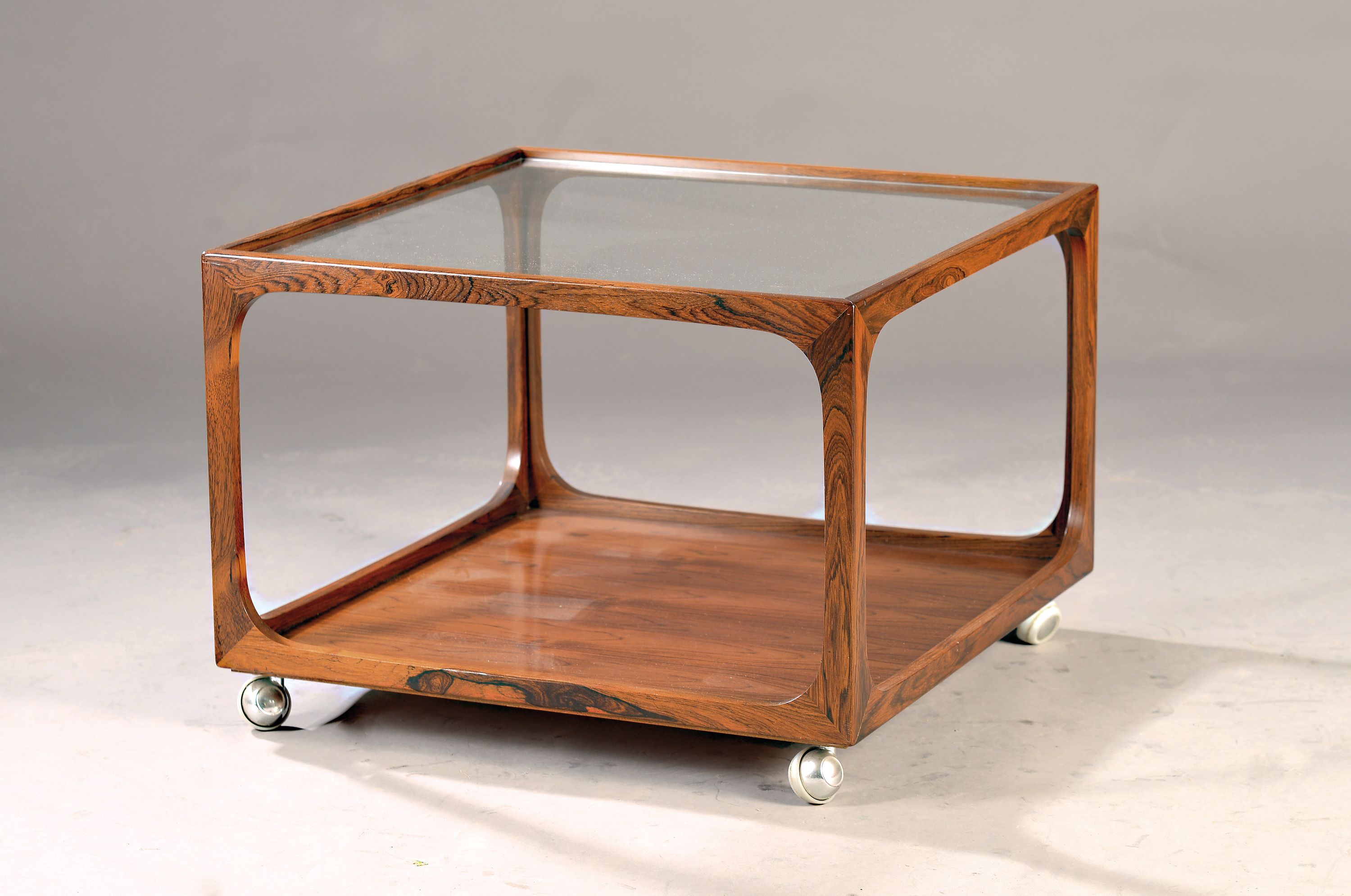 Beistelltisch/Rolltisch, Wilhelm Renz, 60/70er J., Palisander massiv, vier Rollen,