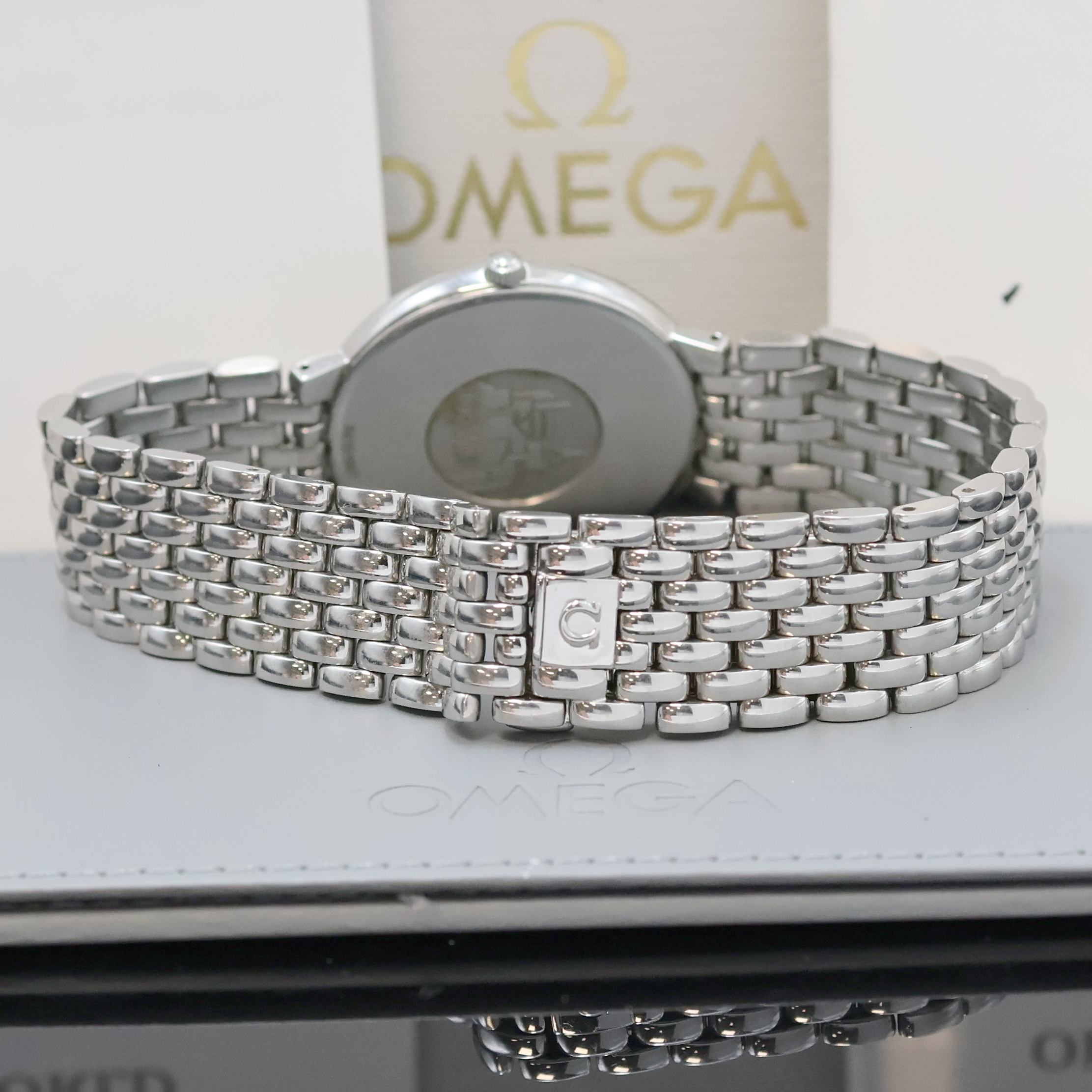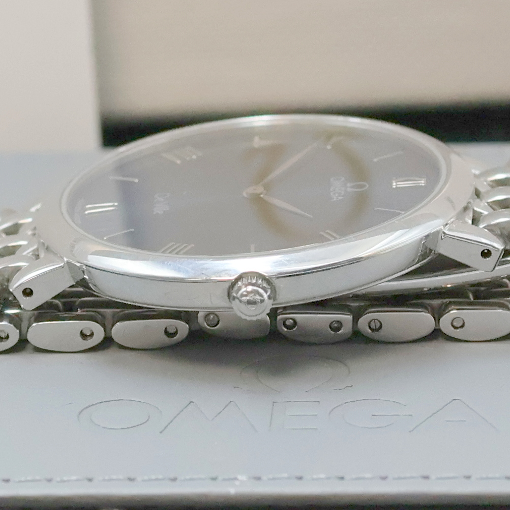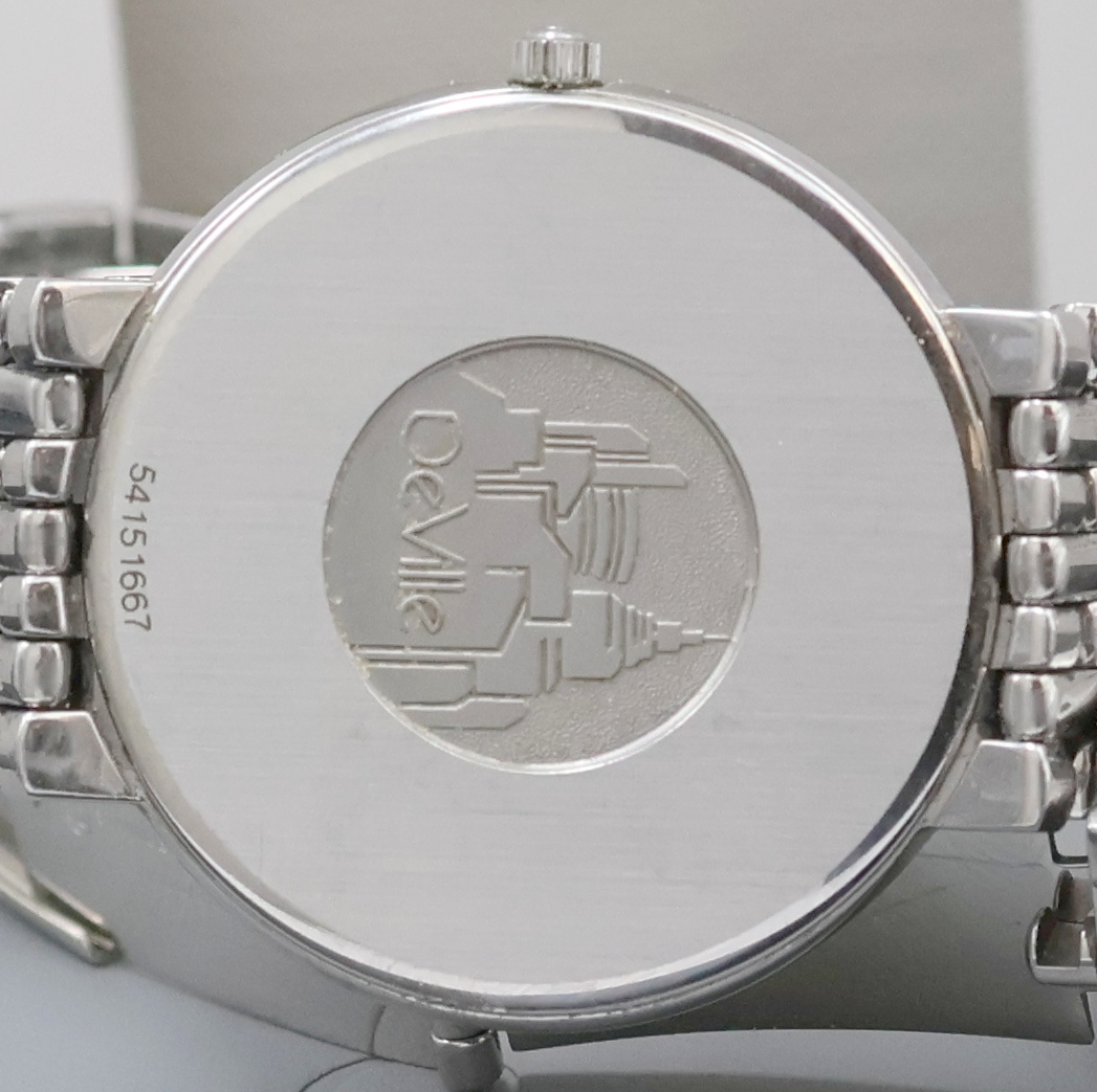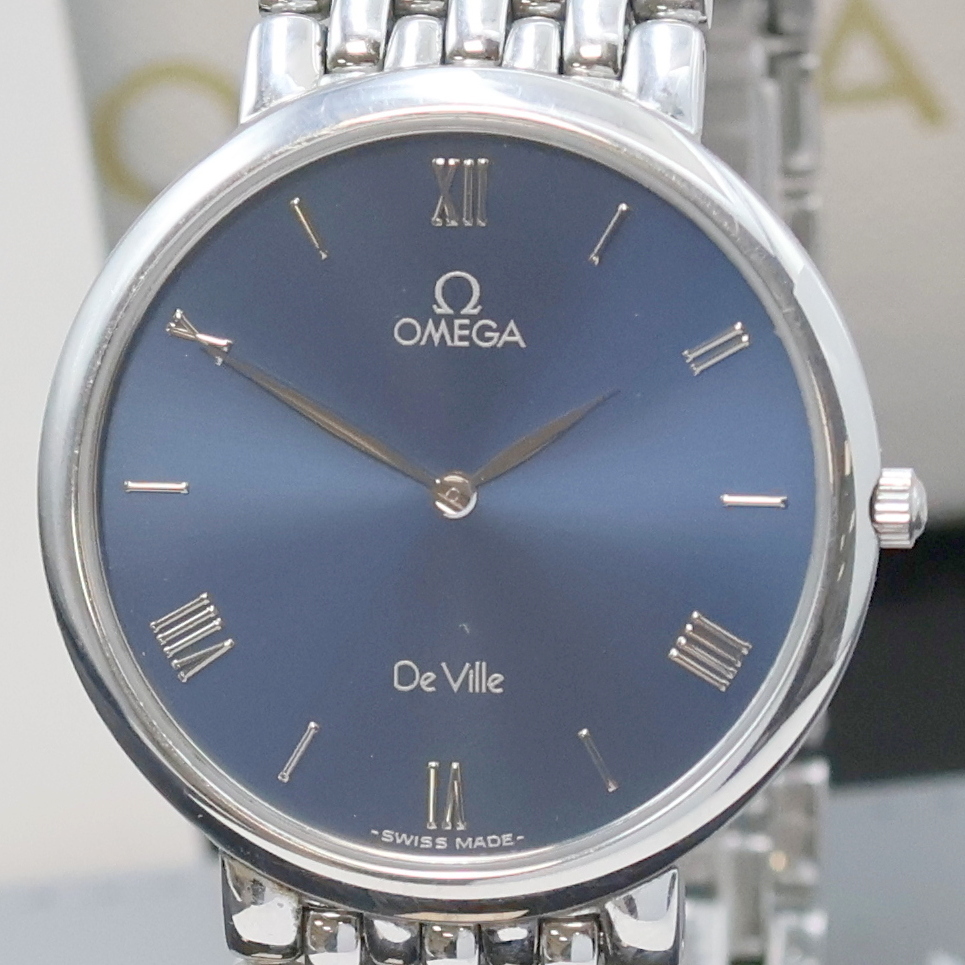 OMEGA De Ville flache Armbanduhr in Edelstahl, Schweiz um 1990, quarz, 2-teil. Geh.