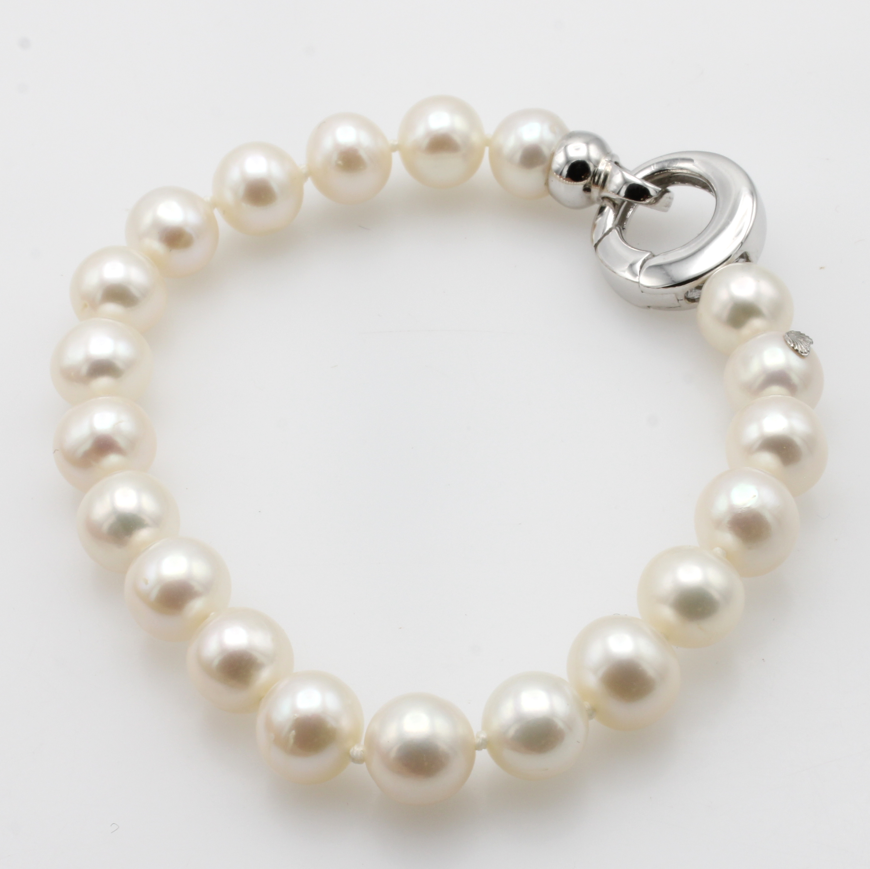 Armband mit Süßwasserzuchtperlen, Schließe 925er Silber, z.T. rhod., weiße Perlen, D. ca.8-9 mm, L. ca. 19 cm Schätzpreis: 210, - EUR