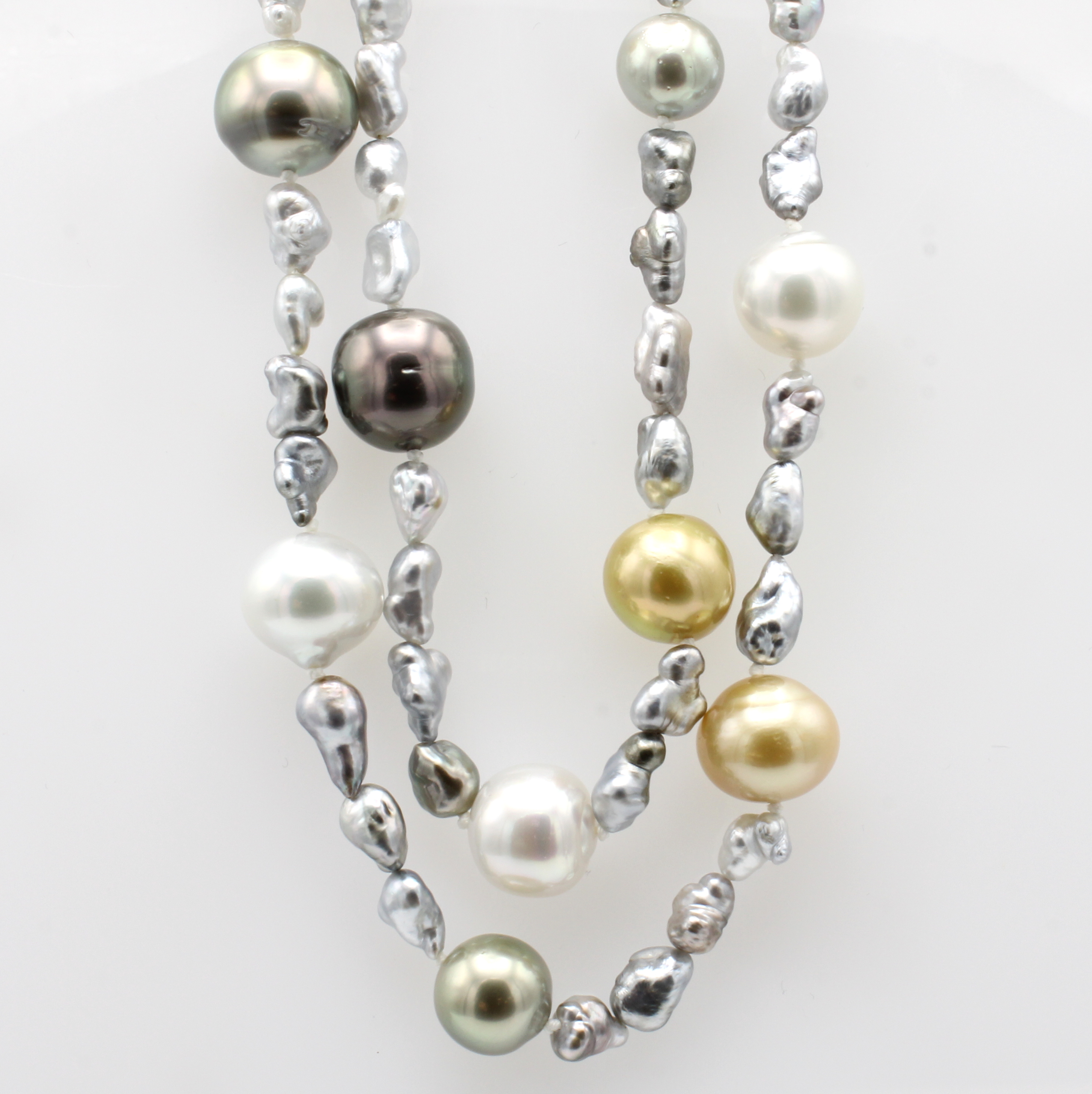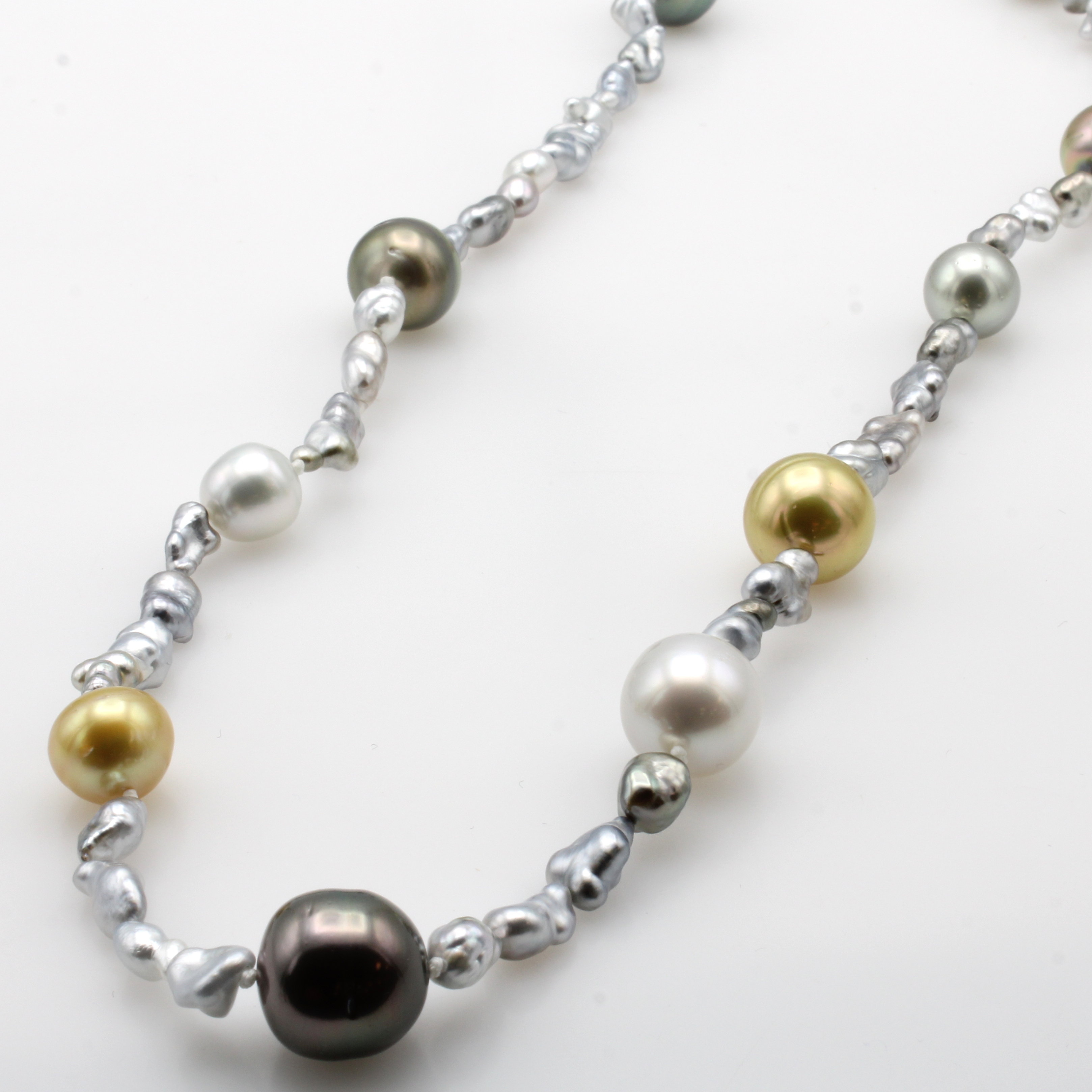 Lange Perlenkette, Karabinerschl. GG 585/000, Südsee-, Tahiti- u. Keshiperlen v. multi- colorfarb. Lüster, D. ca. 6-12 mm, L. ca. 100 cm