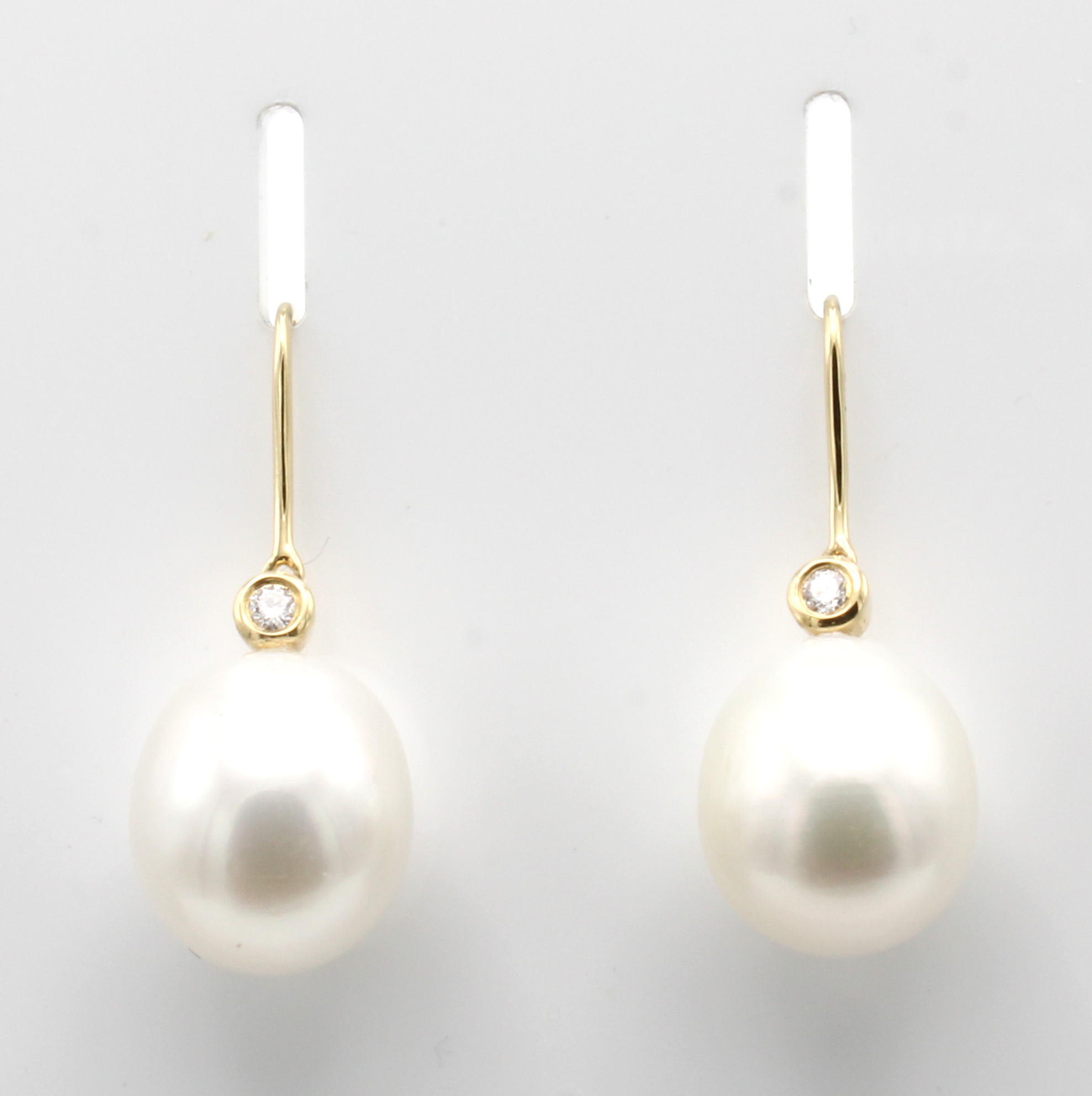 Paar Ohrgehänge mit Südseezuchtperlen und Brillanten, GG 585/000, 2 Brill. zus. ca. 0.10 ct Weiß/si, weiße Perlen in Tropfenform D. ca. 12-13 mm Schätzpreis: 2800, - EUR