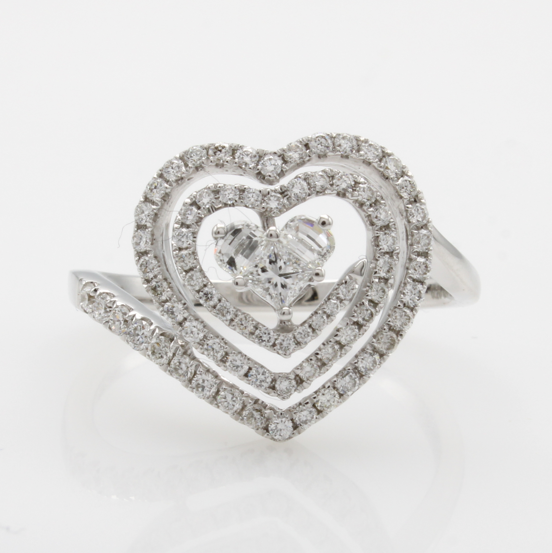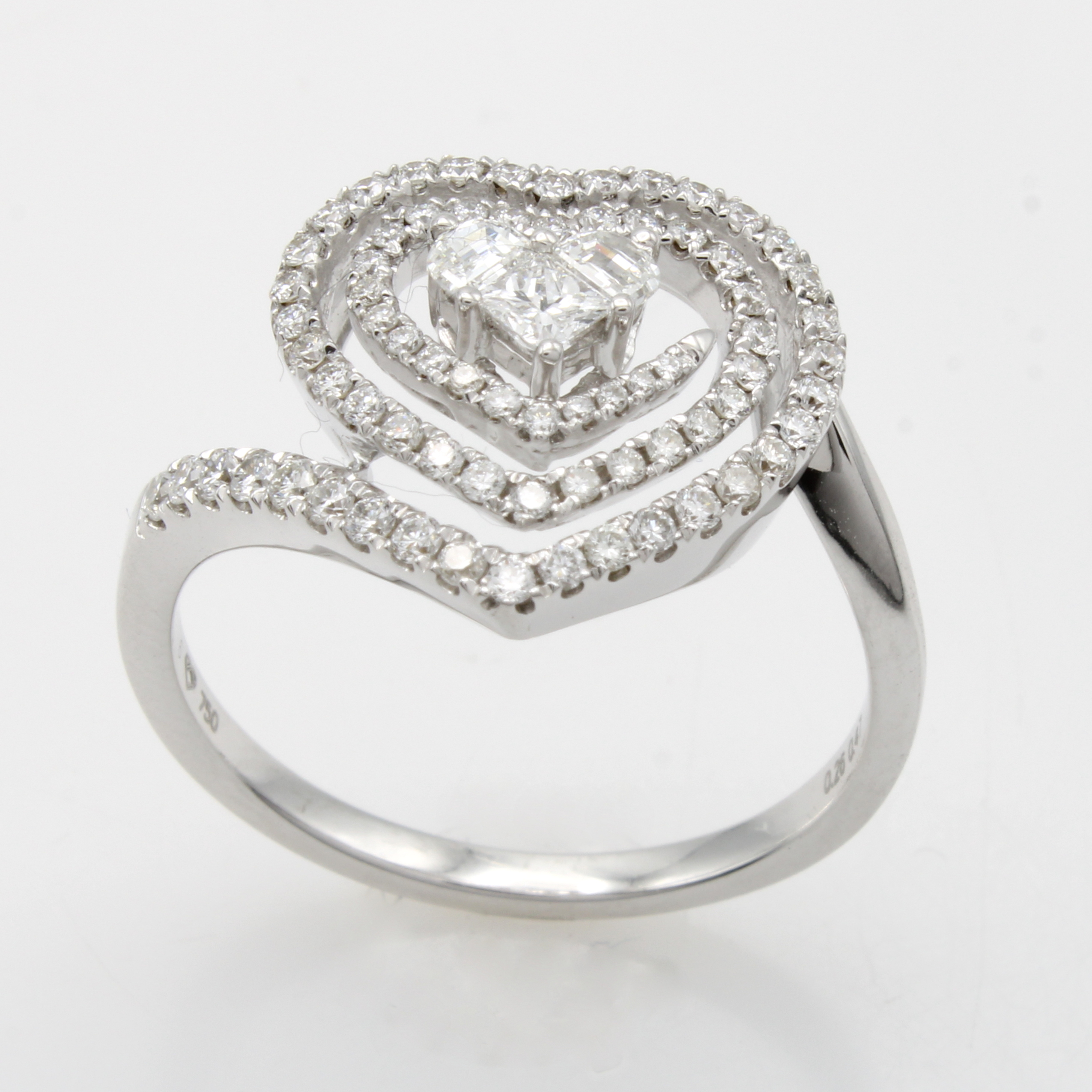 Herzring mit Brillanten und Diamanten, WG 750/000, 3 Diam. (invisible setting) u. Brill.zus. ca. 0.73 ct feines Weiß/vs, RW ca. 58 Schätzpreis: 3300, - EUR