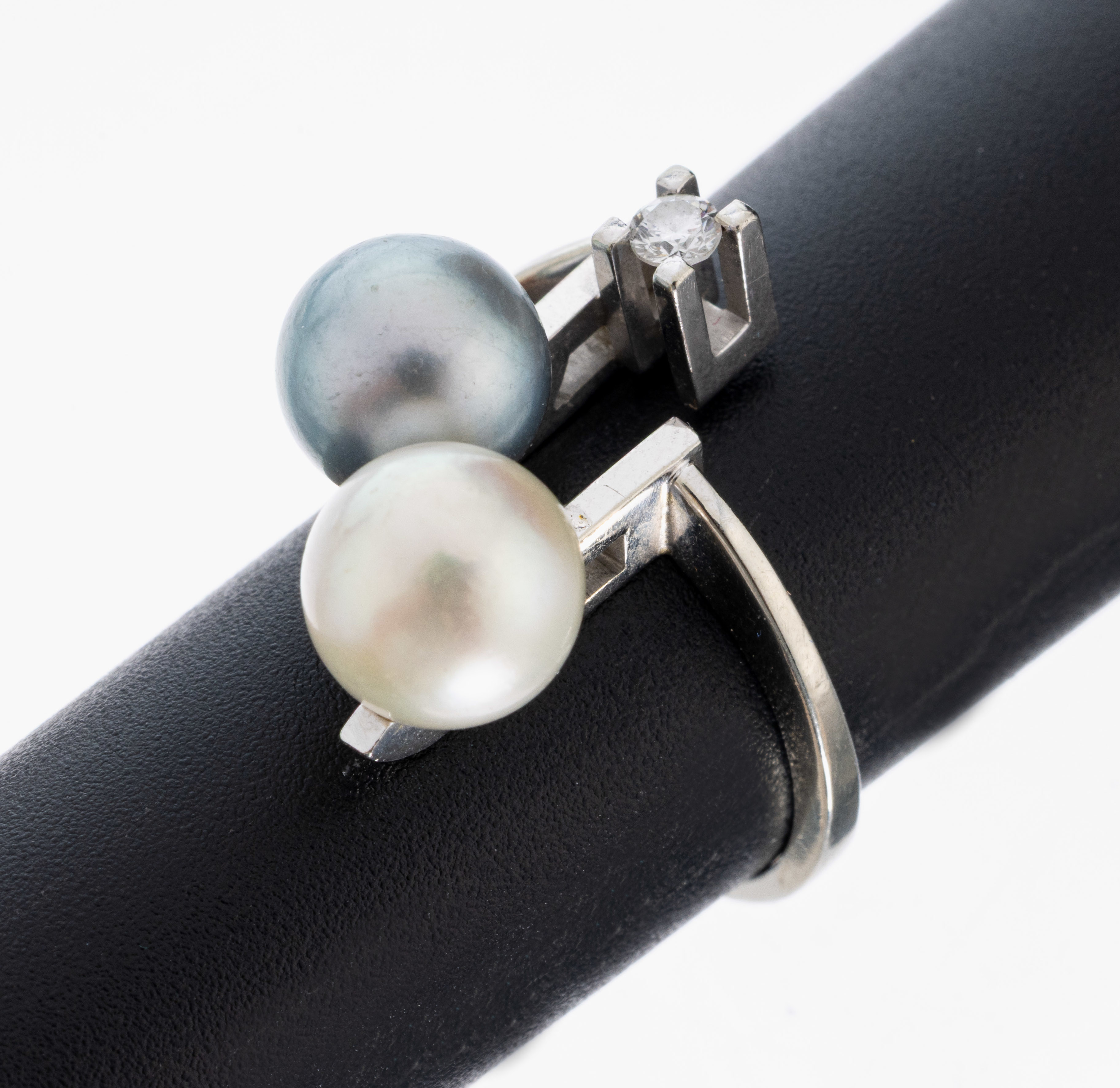 14 kt Gold Perl-Brillant-Ring, WG 585/000, silbergraue und weiße Zuchtperle, D.