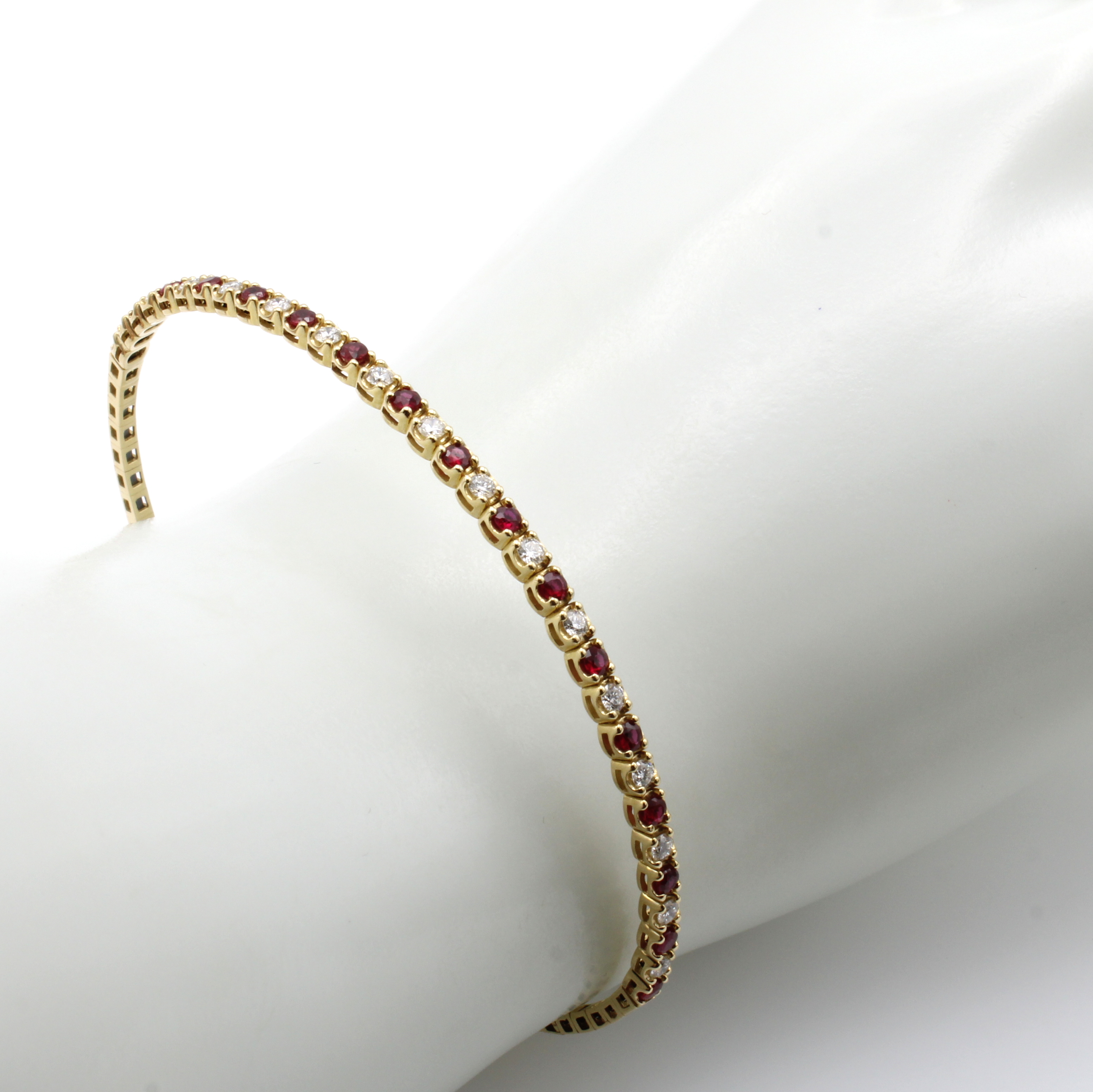 Armreif mit Brillanten und Rubinen, GG 585/ 000, l. bewegl. gearbeitet, Brill. zus. ca. 0.48 ct Weiß/si u. Rubine zus. ca. 0.65 ct, mit Steckschließe Schätzpreis: 4000, - EUR