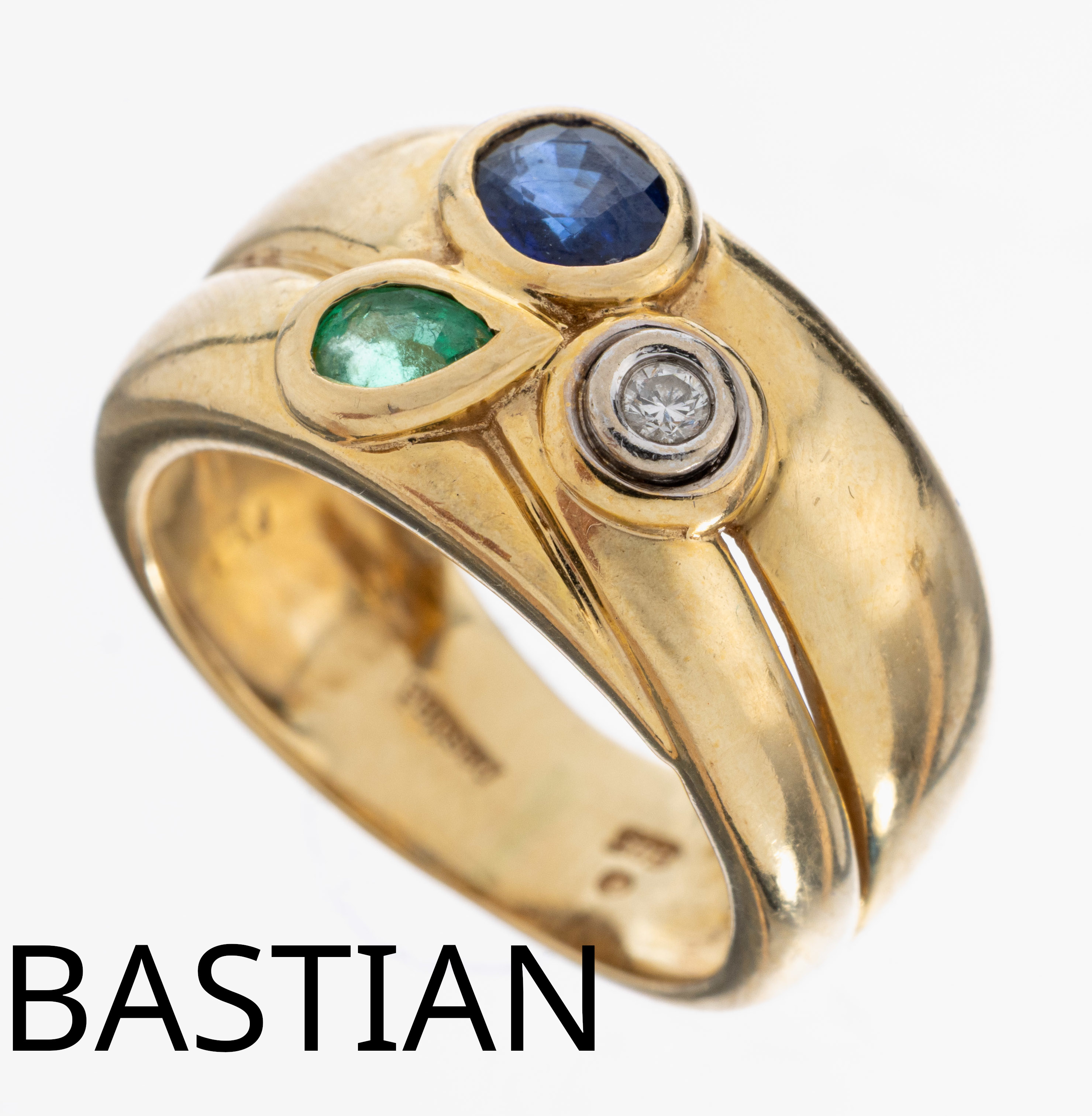 14 kt Gold Saphir-Smaragd-Brillant-Ring, GG/WG 585/000, mittig facett. Smaragd-Tropfen