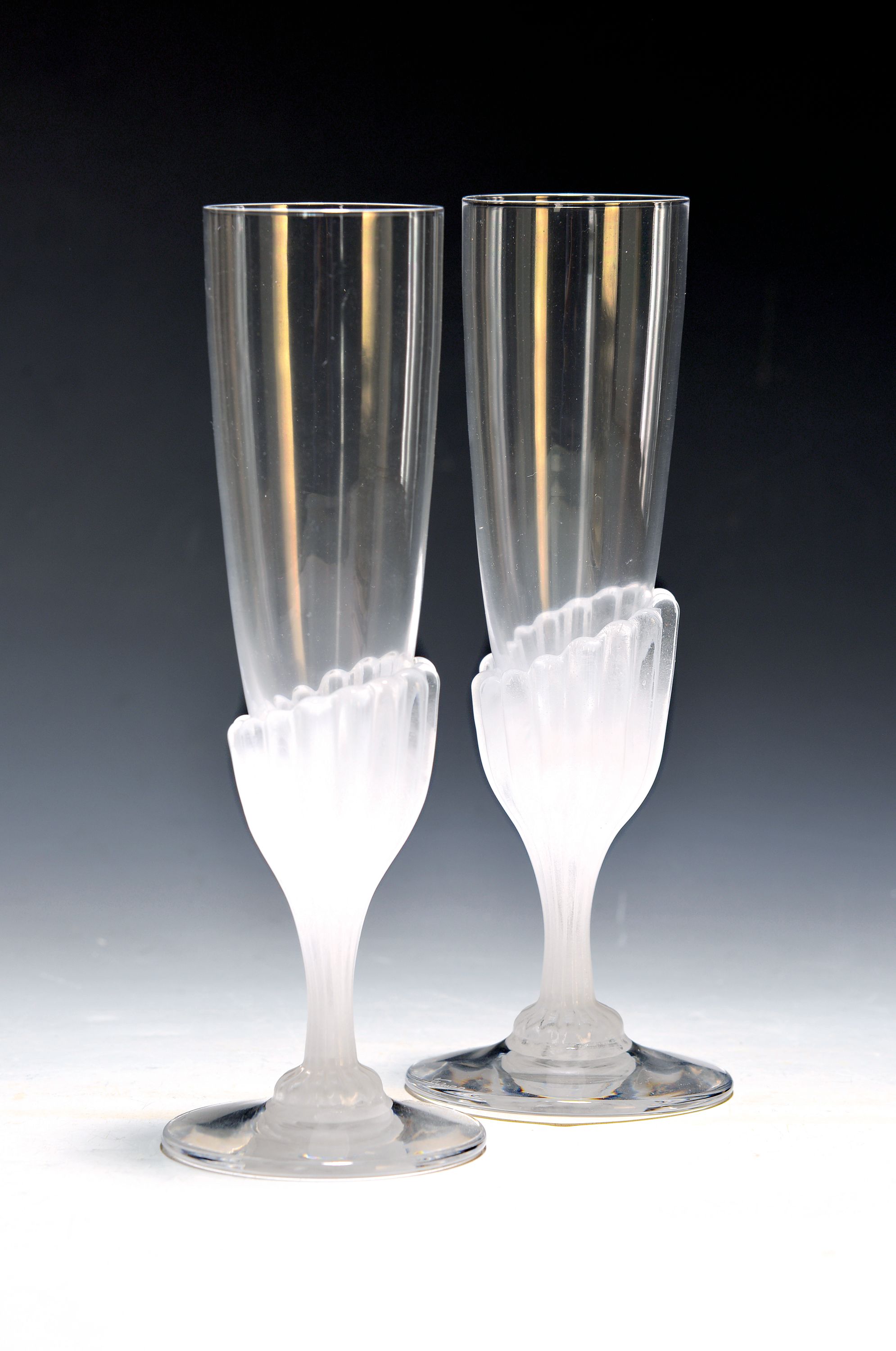 Paar Sektkelche/Sektflöten, Daum Nancy, farbloses Glas, Fuß mit weißen Einschmelzungen/Glaspaste,