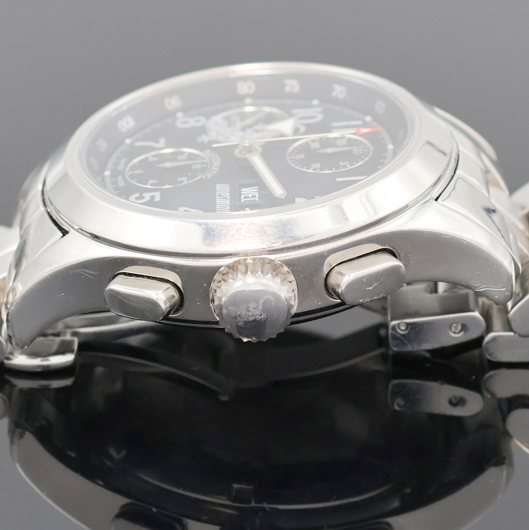 Zähler, kl. Sek. b. 9, Tag u. Datum b. 3 (Datumschaltung zu rep.), Tachymeterskala,