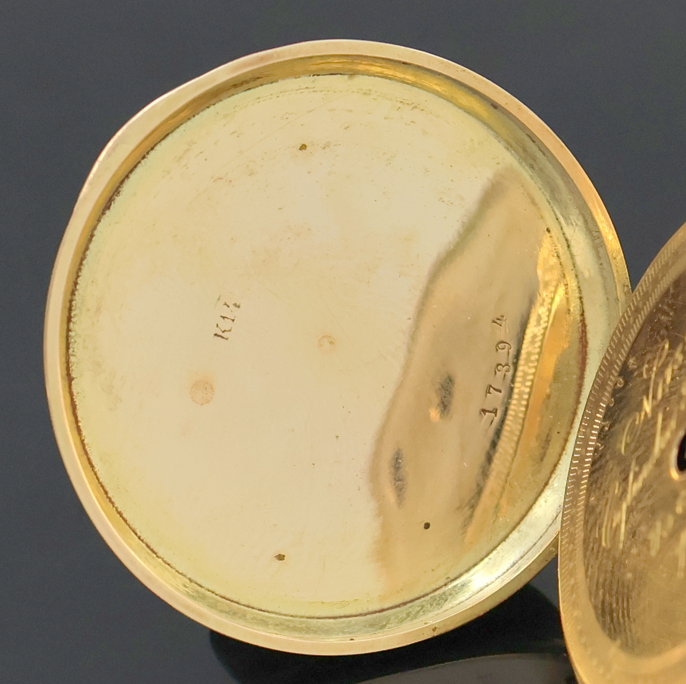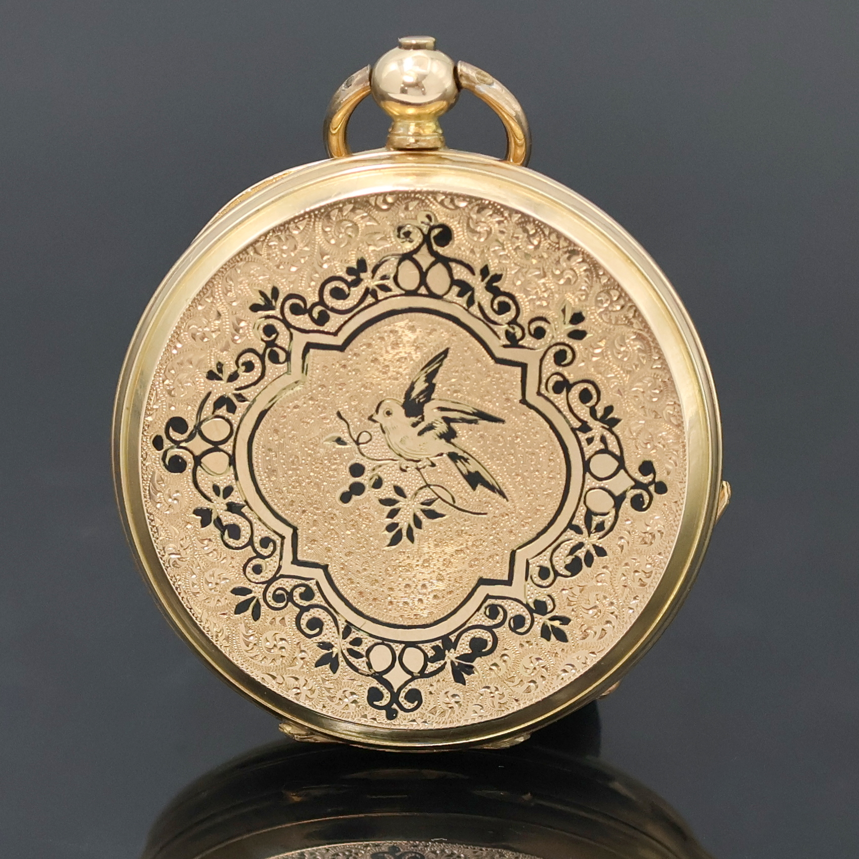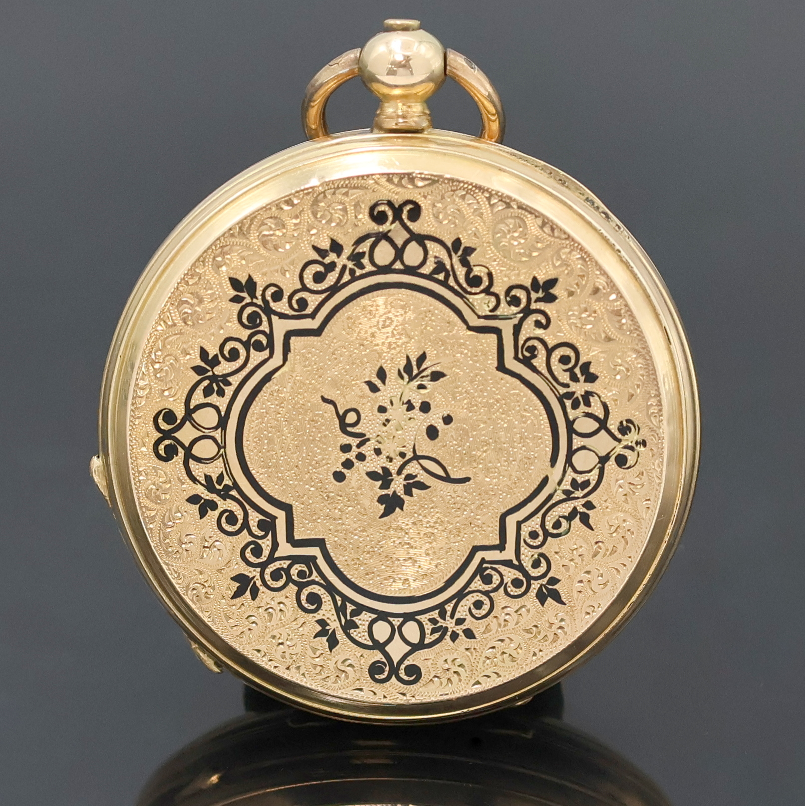 Goldgeh., Schlüsselaufzug, Sprung- u. Rückdeckel floral grav., Emailzifferbl. l.