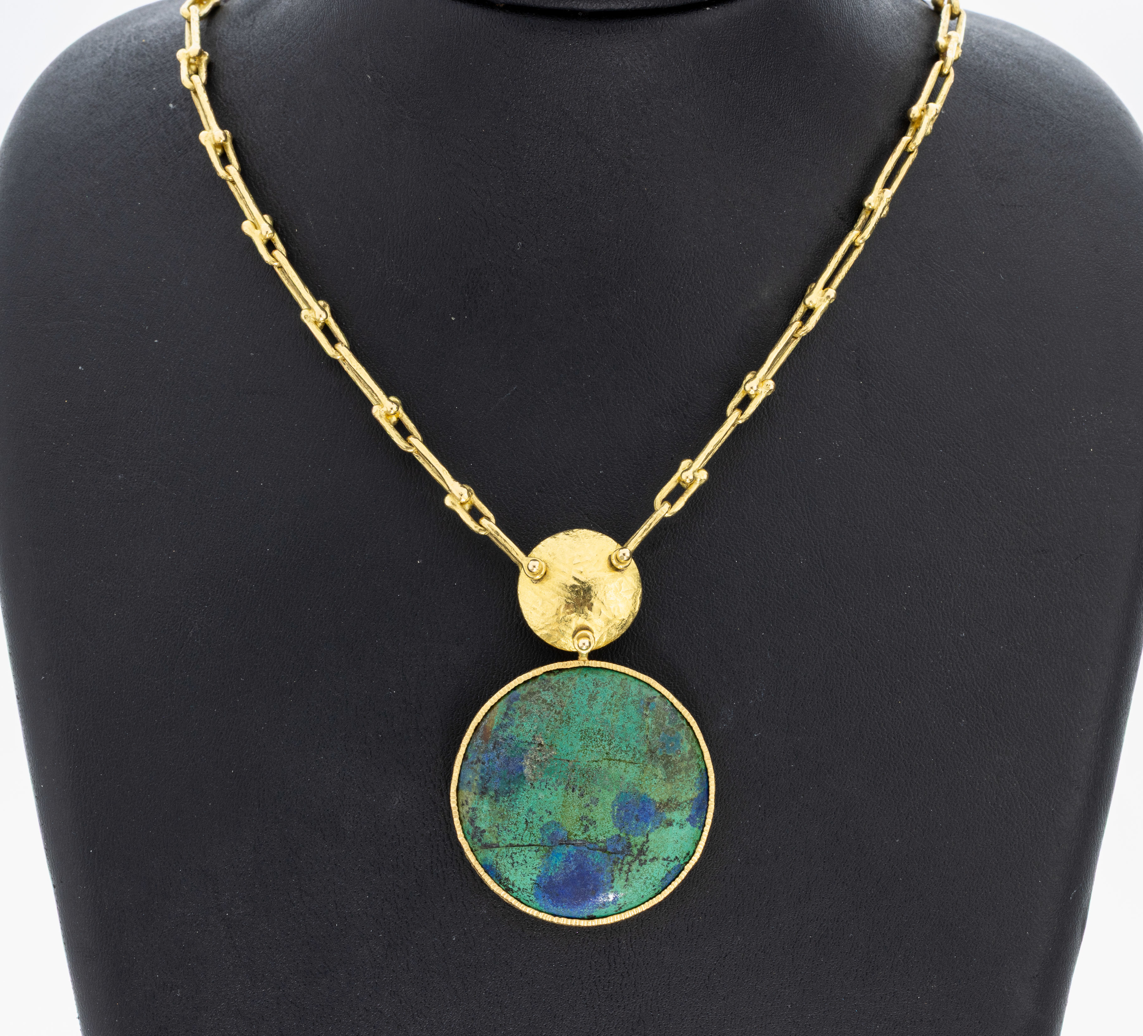 18 kt Gold Farbstein-Collier, GG 750/000, runde Azurit-Malachit Einlage, qualitätvolle,