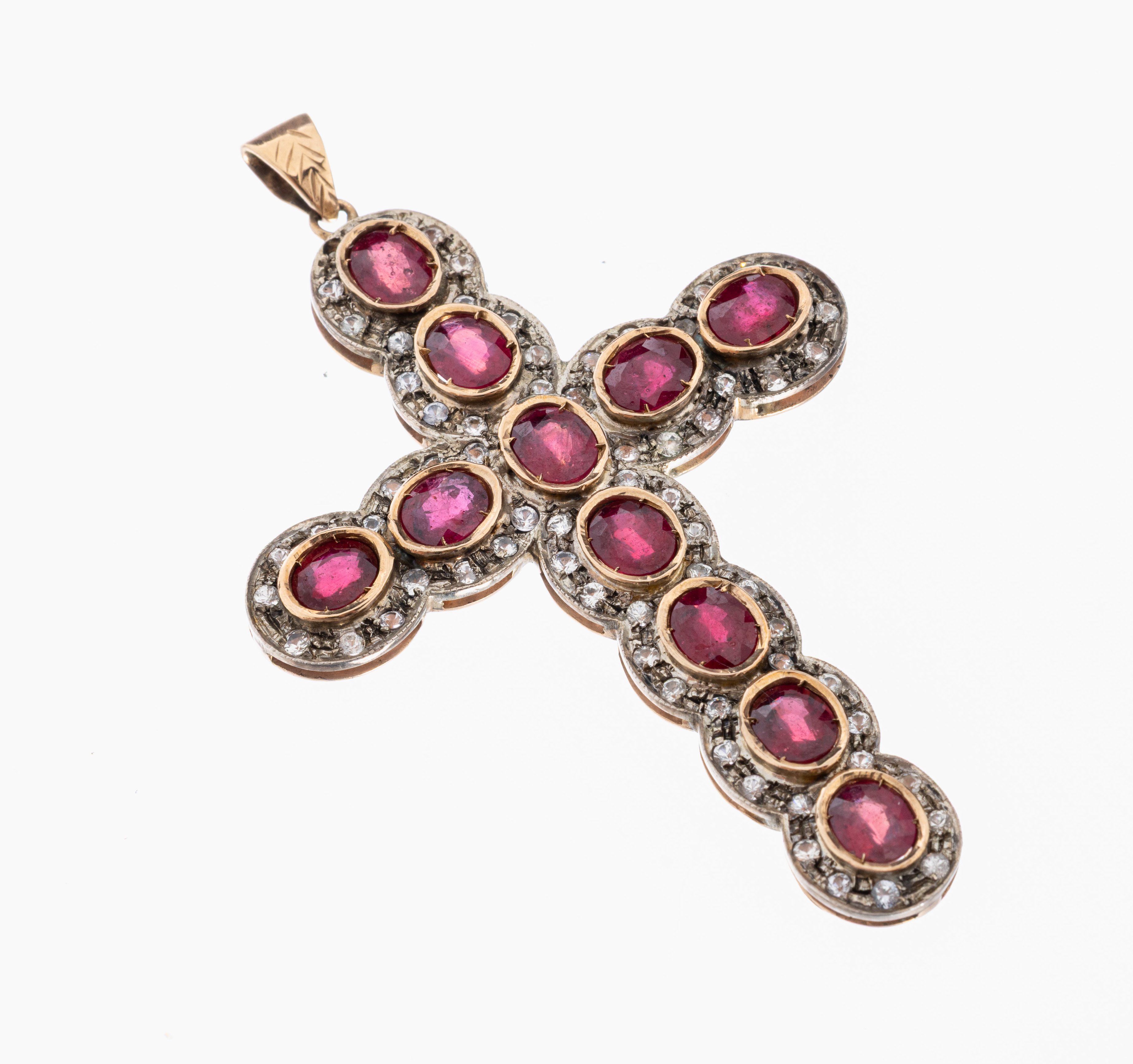 9 kt Gold Farbstein-Kreuzanhänger, GG/WG 375/000, weiße und rote Synthesen, ca.