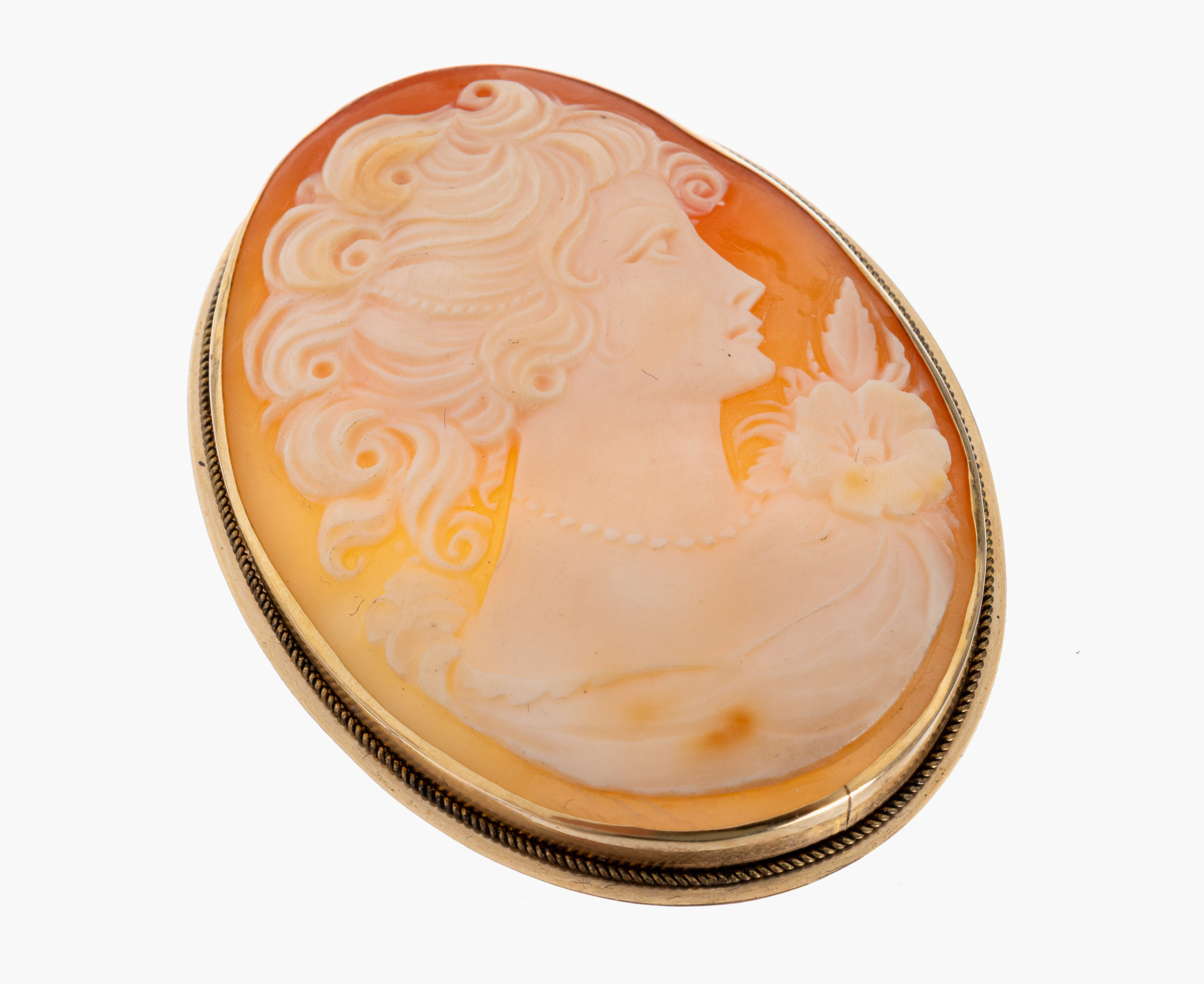 14 kt Gold Kamee-Brosche, GG 585/000, auch als Anhänger tragbar, Muschelkamee, Darstellung