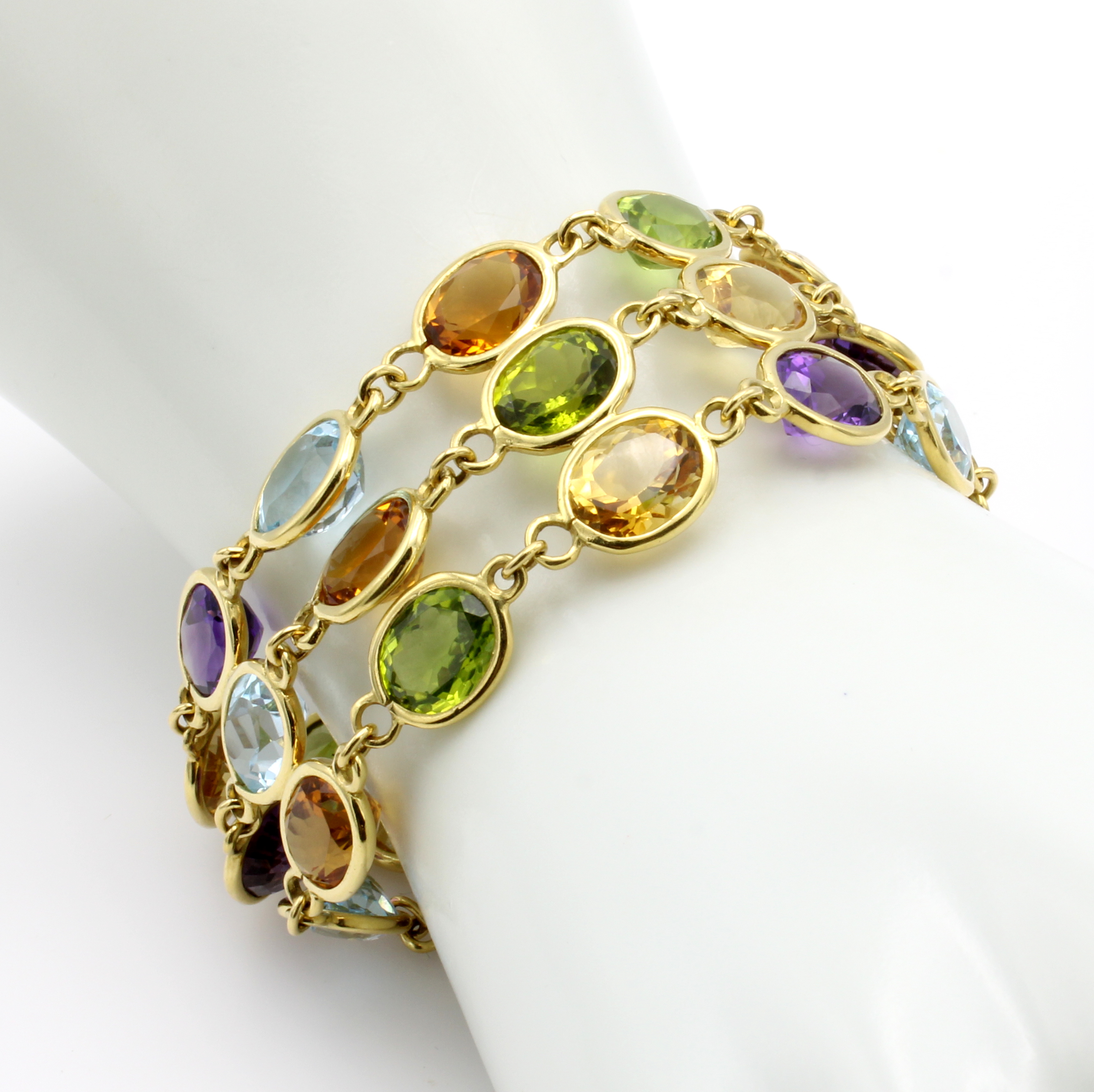 3-reihiges Armband mit Farbsteinen und Brillanten, GG 750/000, Topase (beh.), Citrine, Amethyste und Peridots, Brill. in Steckschließe gef. zus. ca. 0.23 ct feines Weiß/si, L. ca. 18.5 cm Schätzpreis: 8000, - EUR