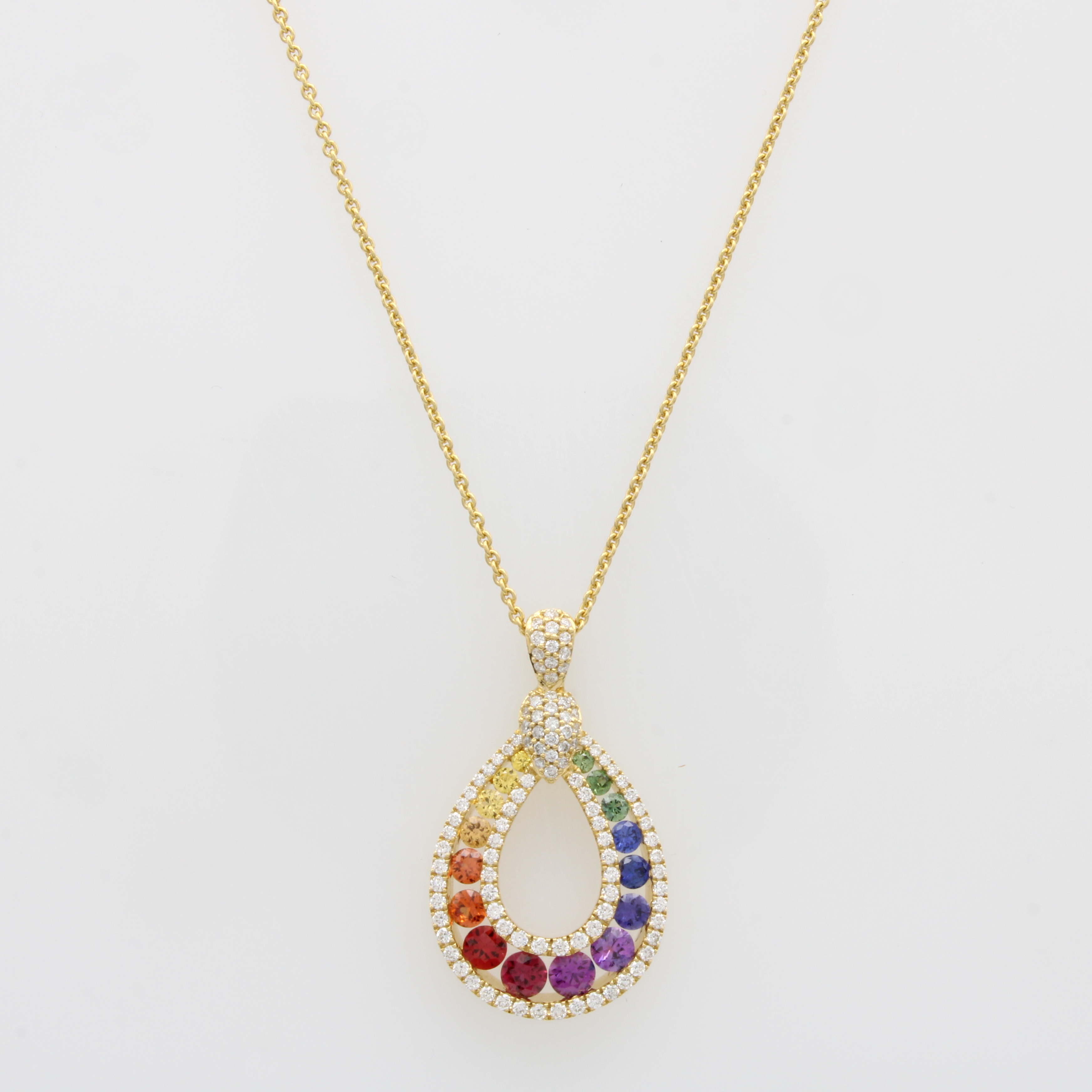 Anhänger "Rainbow" mit Saphiren und Brillanten an Kette, GG 750/000, fancy Saphire zus. ca. 0.92 ct, Brill. zus. ca. 0.46 ct feines Weiß/vs, Tropfenform, L. ca. 40.4 cm Schätzpreis: 5300, - EUR