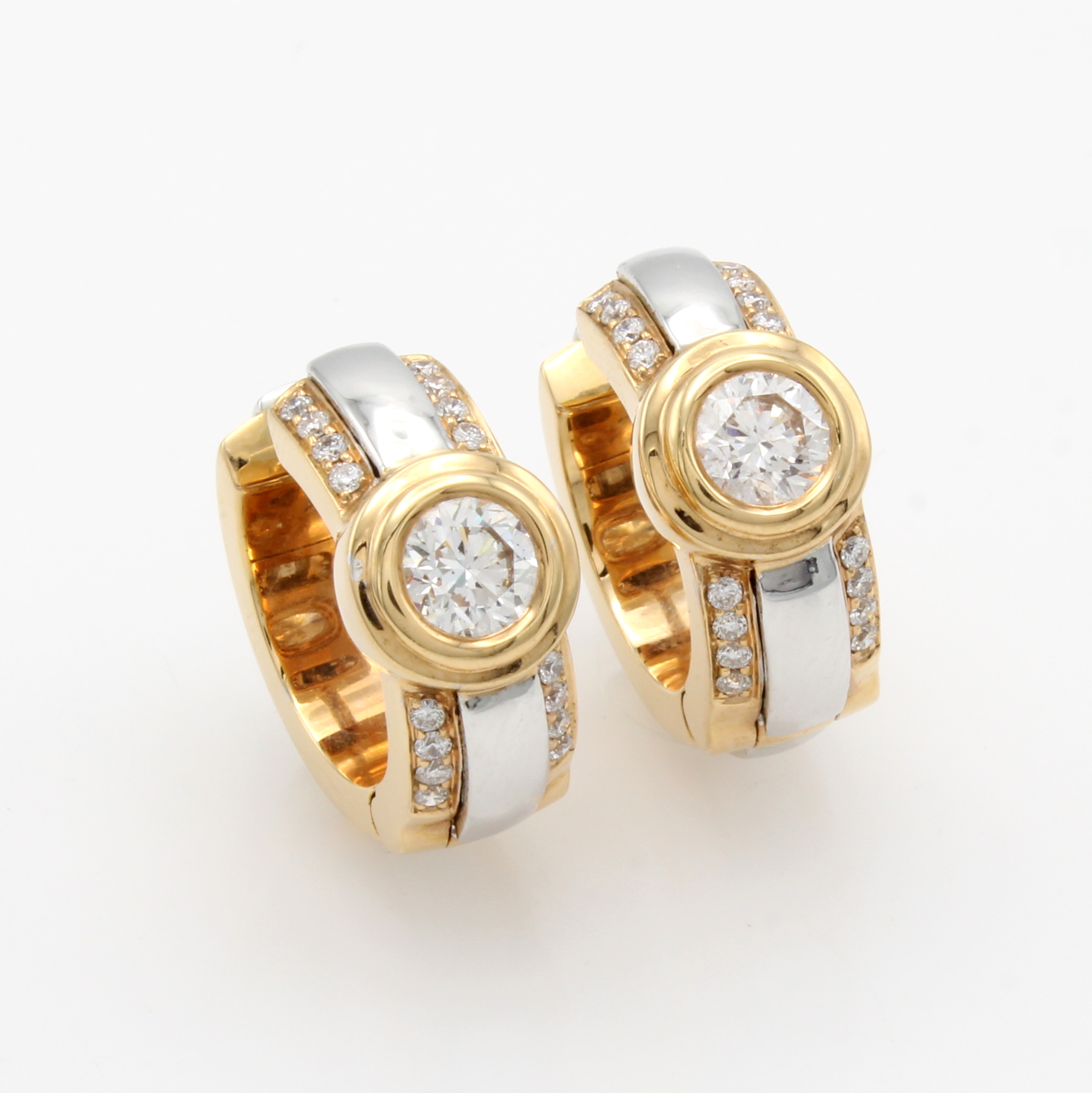 Paar Klappcreolen mit Brillanten, WG/RoséG 750/000, 2 Brillantsolitäre zus. ca. 1 ct l.get.Weiß/vs, Besatzbrill. zus. ca. 0.26 ct feines Weiß/vs Schätzpreis: 13900, - EUR