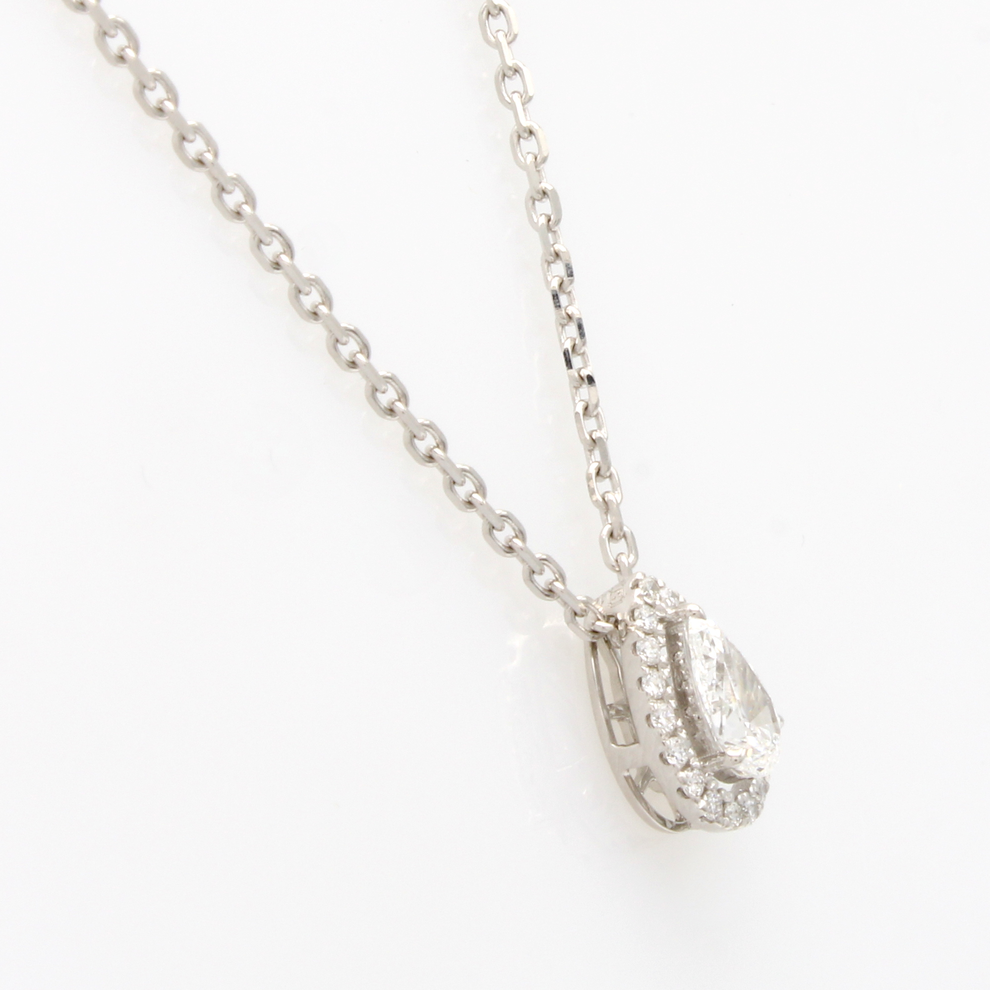 Anhänger mit Diamant und Brillanten an Kette, WG 750/000, Diamanttropfen ca. 0.55 ct hochfeines Weiß+(D)/lupenr. umgeben v. Brill. zus. ca. 0.13 ct feines Weiß/vs, in L. ca. 40 u. 43 cm zu tragen Schätzpreis: 6000, - EUR