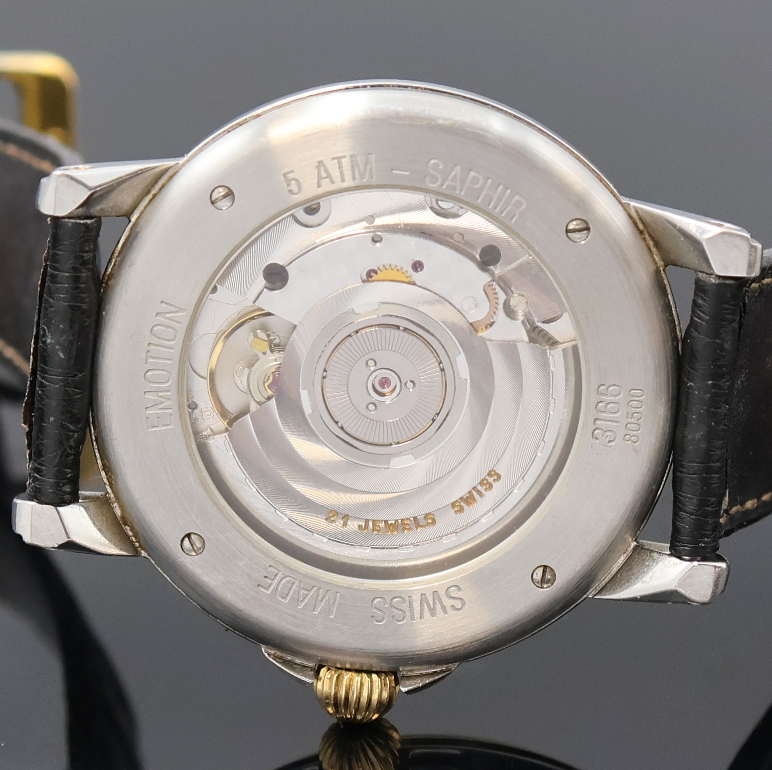 Automatik, beids. vergl. Stahlgeh., Boden 4-fach verschr., neutr. Lederband (zu ers.)