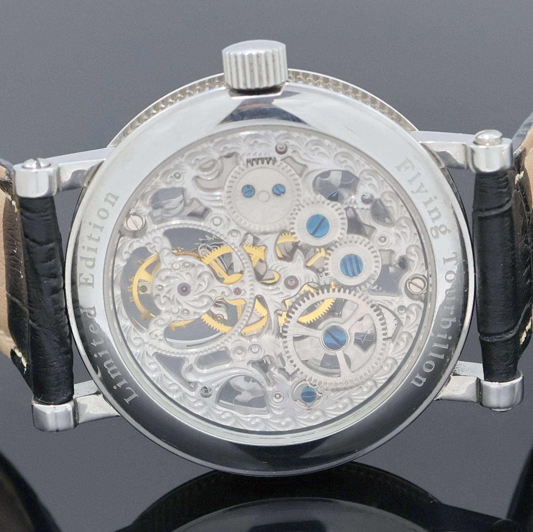 Flying Tourbillon Herrenarmbanduhr in Stahl, China um 2000, Handaufzug, beids. vergl.