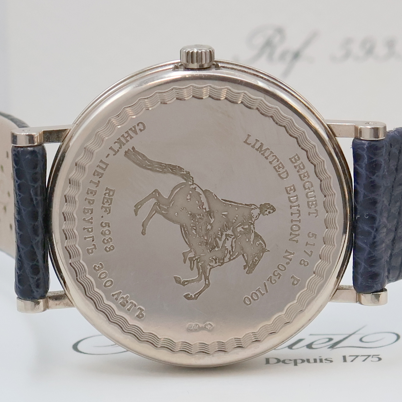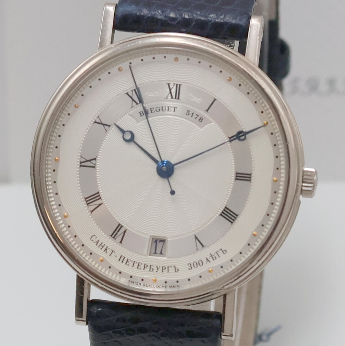 BREGUET Classique seltene, auf 100 Stück limitierte Herrenarmbanduhr in WG 750/000 Referenz 5933, Schweiz verk. lt. beil. Pap. 10/2005, Automatik, Anlässlich des 300. Jahrestag der Gründung von St. Petersburg, Lederband m. orig. WG 750/000 Dornschl., aufgedr. Boden m. Gravur eines Reiters m. der Schrift Sankt Petersburg, silb. Zifferbl. teils guill., röm. Zahlen, gebl. Zeiger, Datum b. 6, Kal. 517/1 m. Streifenschl., 28 St., 5 Adj., D. ca. 36 mm, Pap. anbei, Überh. empf., EZ 2, aus Sammlungsauflösung