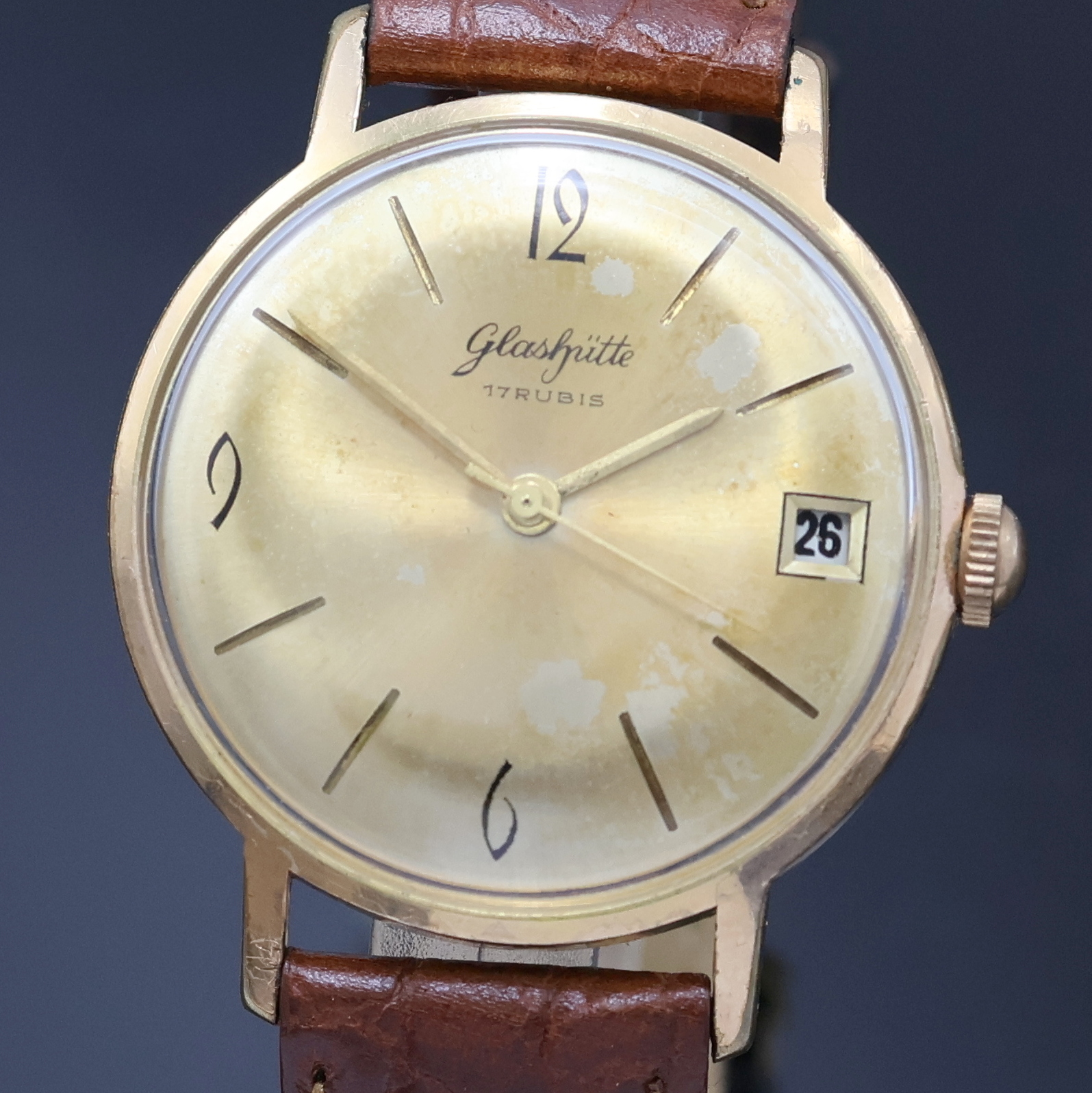 aufgedr., goldfarb. Zifferbl. (berieben), gold. Std.-Ind. u. Zeiger, Datum b. 3,