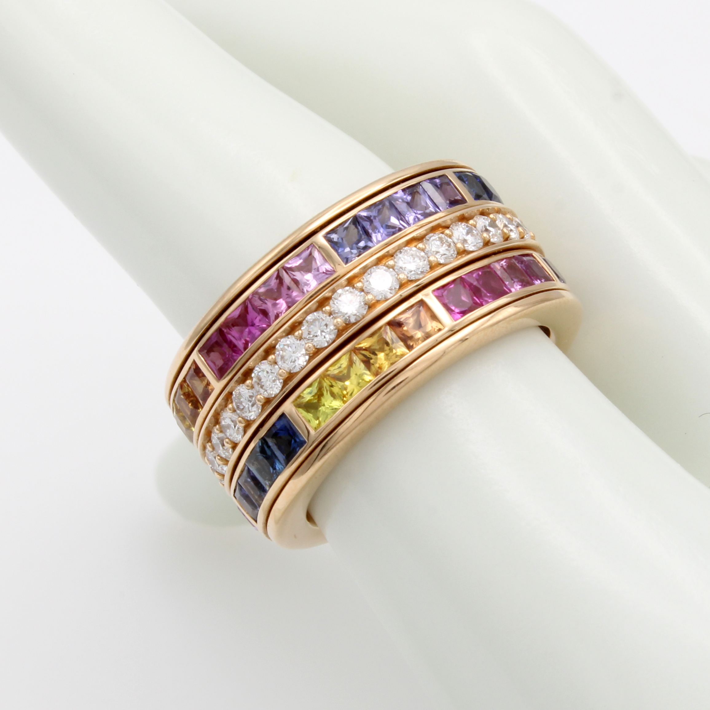 Ring mit Saphiren und Brillanten, RG 750/000, fancy Saphircarrées zus. ca. 5.76 ct, Brill. zus. ca. 1.27 ct feines Weiß/vs, 3-rhg. Optik, drehbare Schiene, RW ca. 55 Schätzpreis: 15000, - EUR
