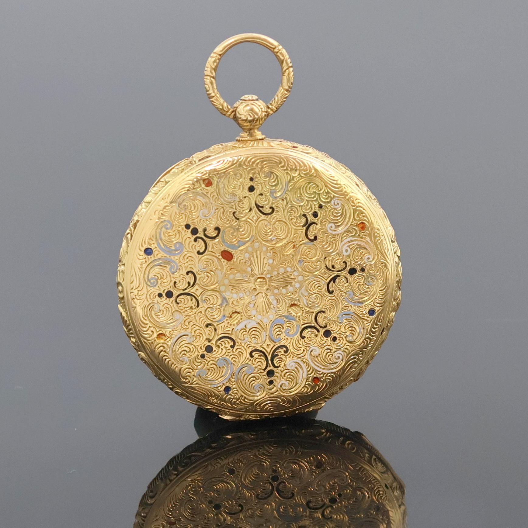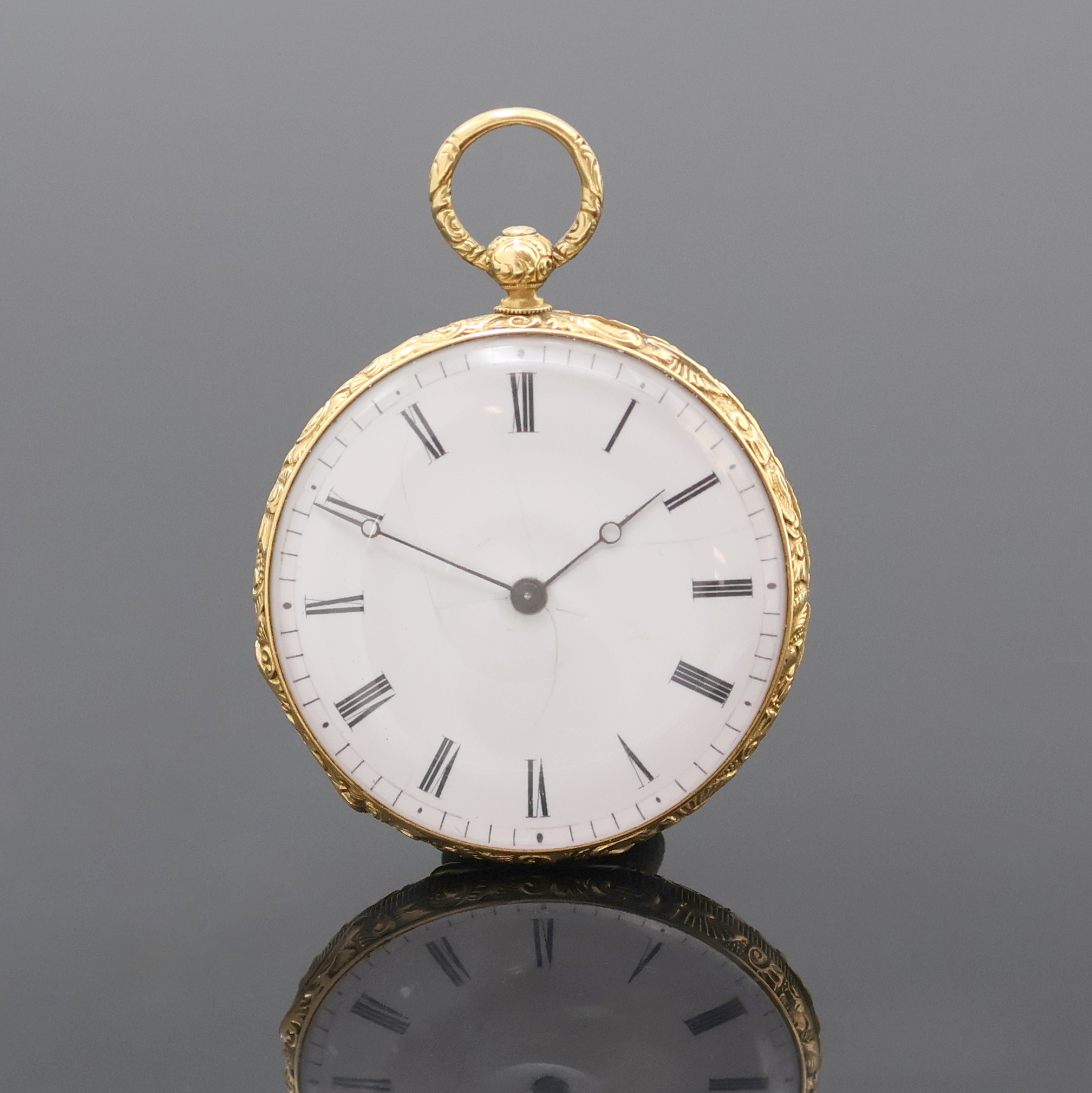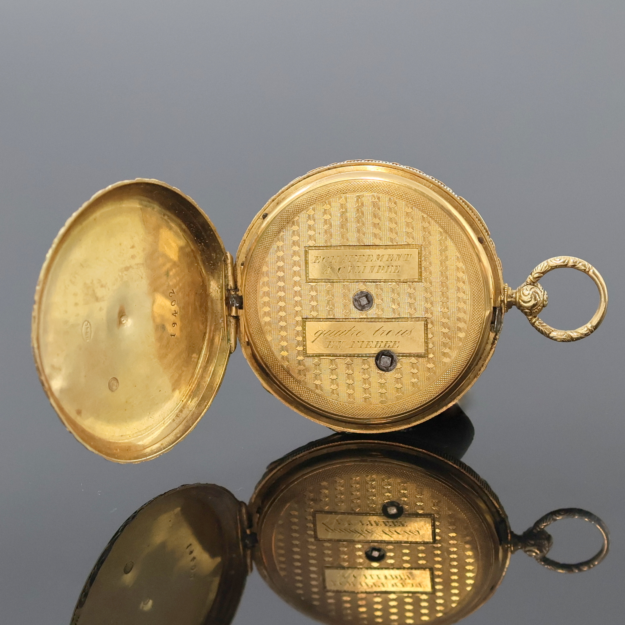 Zylindertaschenuhr in GG 750/000, Schweiz um 1870, floral grav. Geh. u. Rückdeckel,