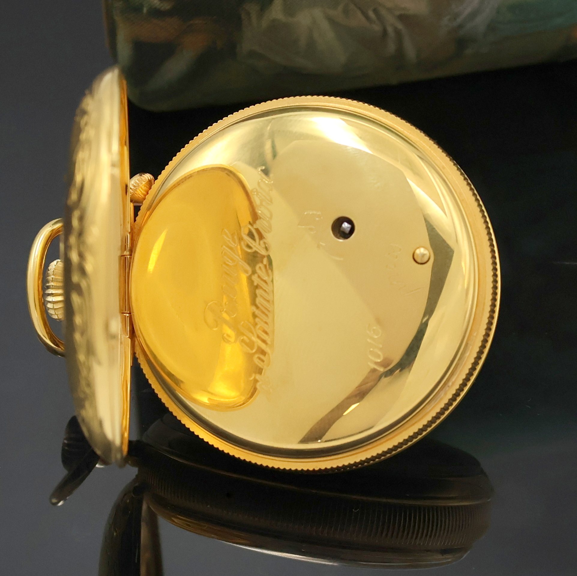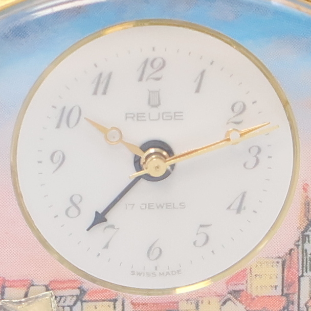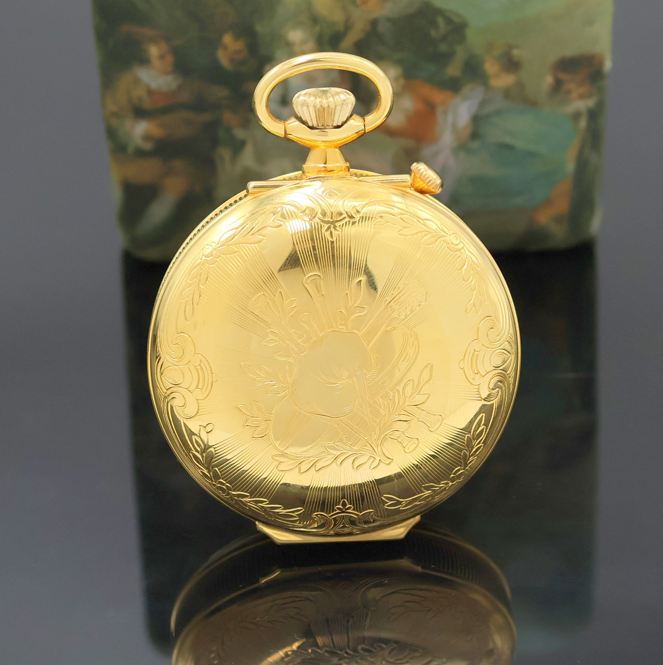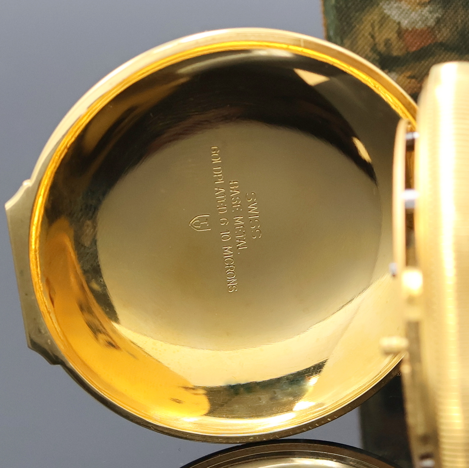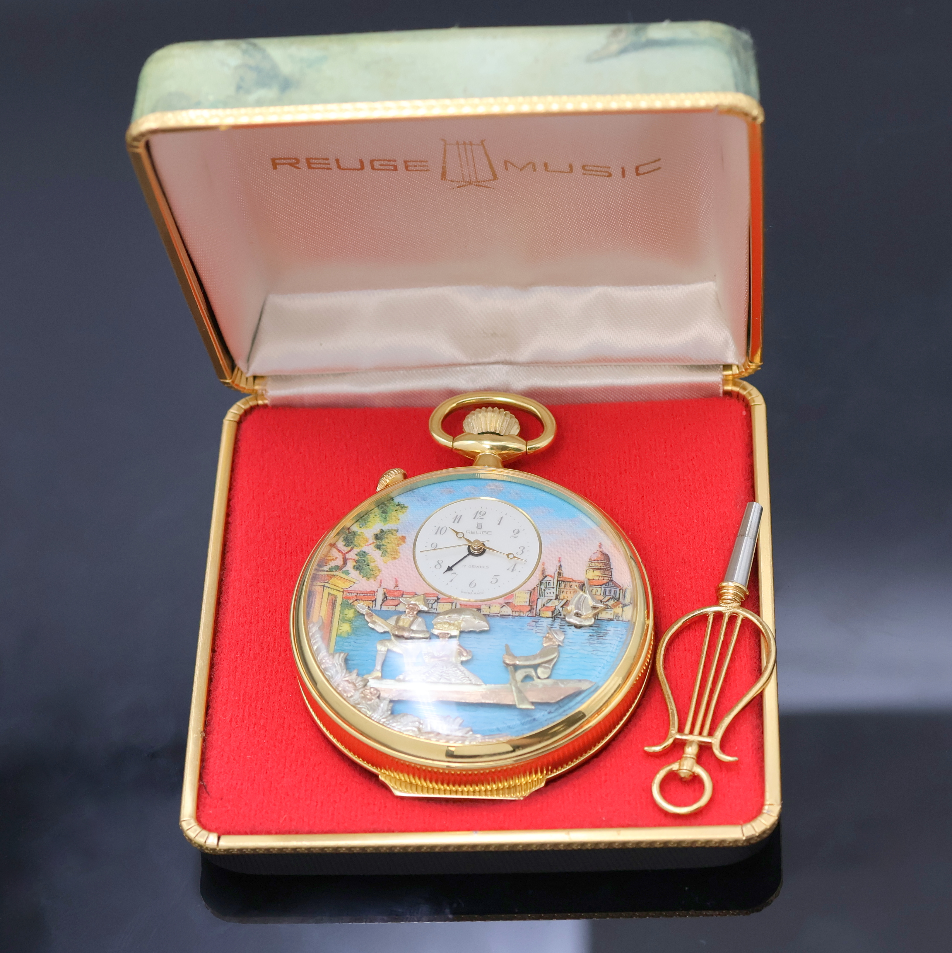 REUGE Taschenuhr mit Wecker-Spieluhr und Figurenautomat, Schweiz um 1990, verg. Geh.,