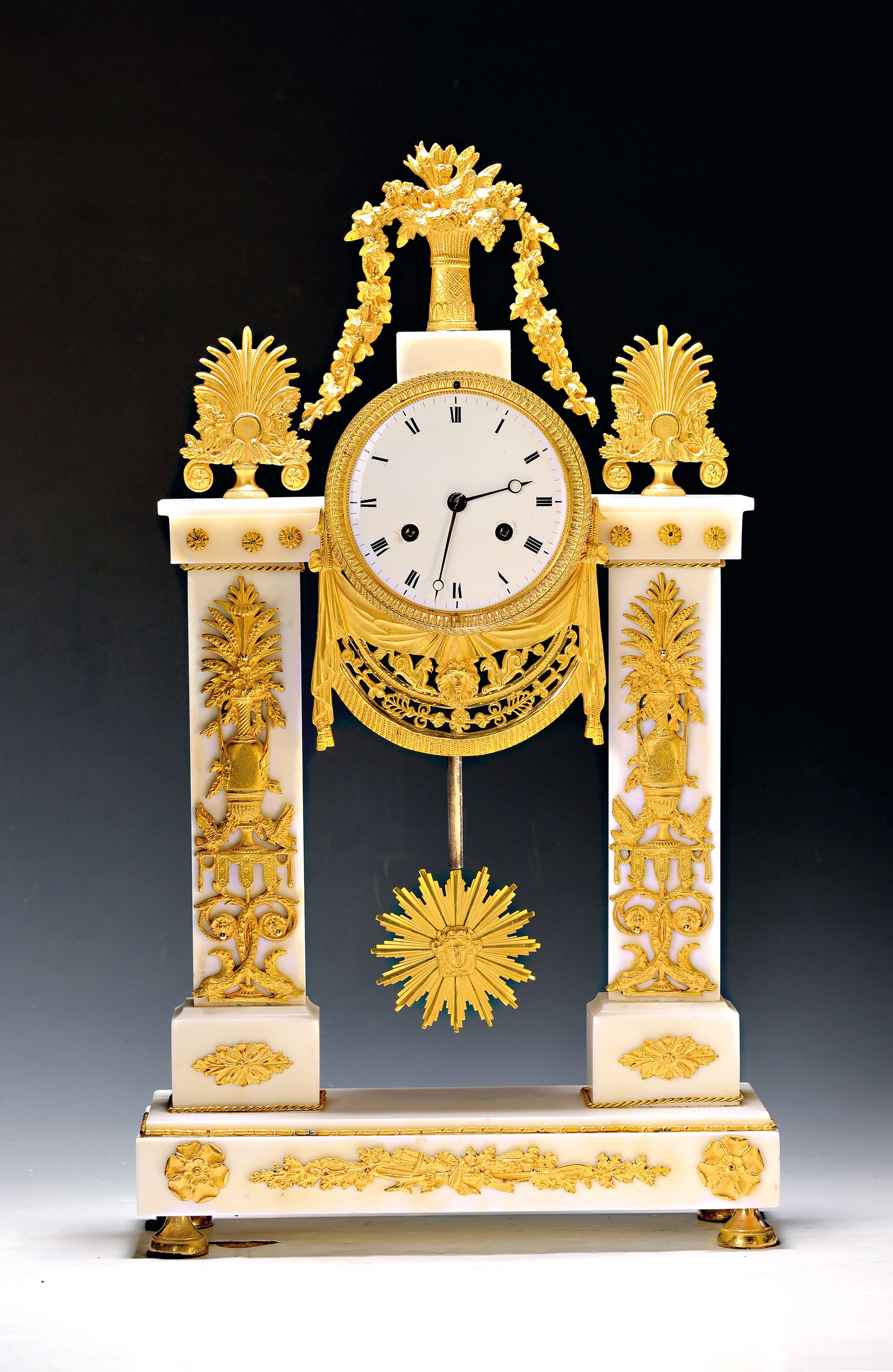 Portaluhr, Frankreich um 1810, weißer Marmor, reich besetzt mit vergoldeten Bronze