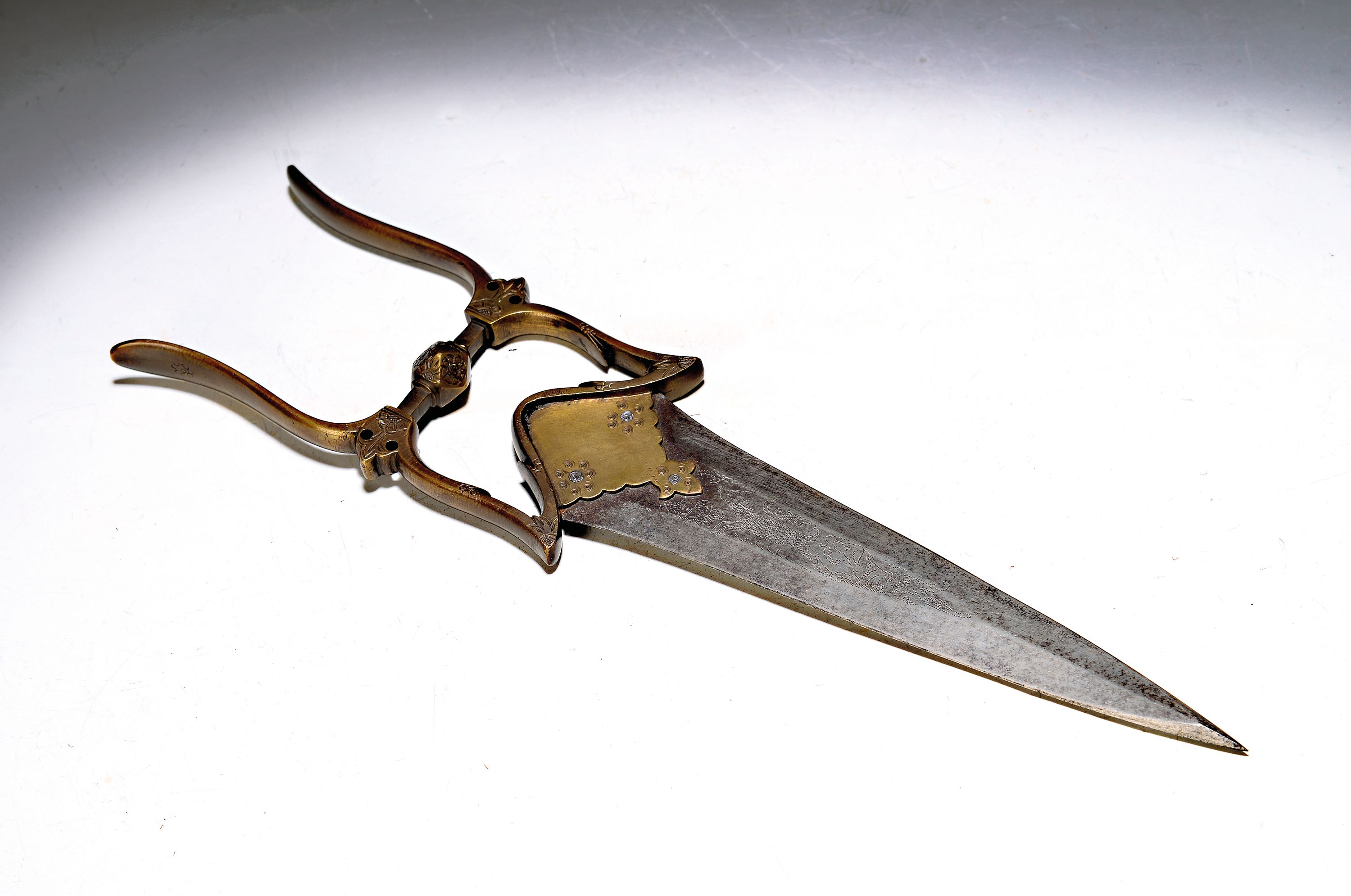 Tigerdolch/Faustdolch, Indien, 19.Jh., Bronzegriff mit Reliefdekor, Stahlklinge mit