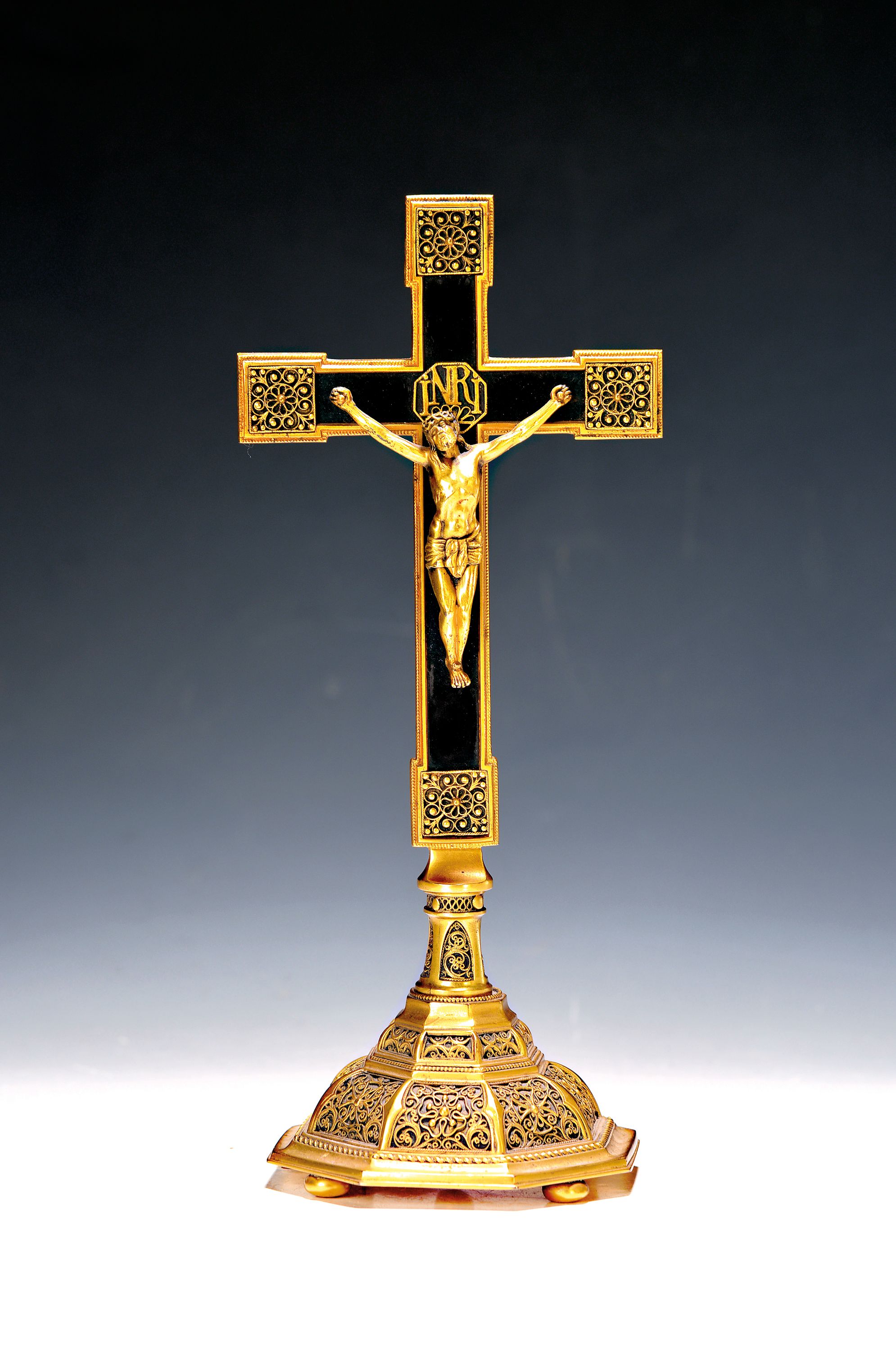 Kruzifix, Werkstatt Erhard & Söhne, Anfang 20. Jh., Kupfer & Messing, vergoldet,