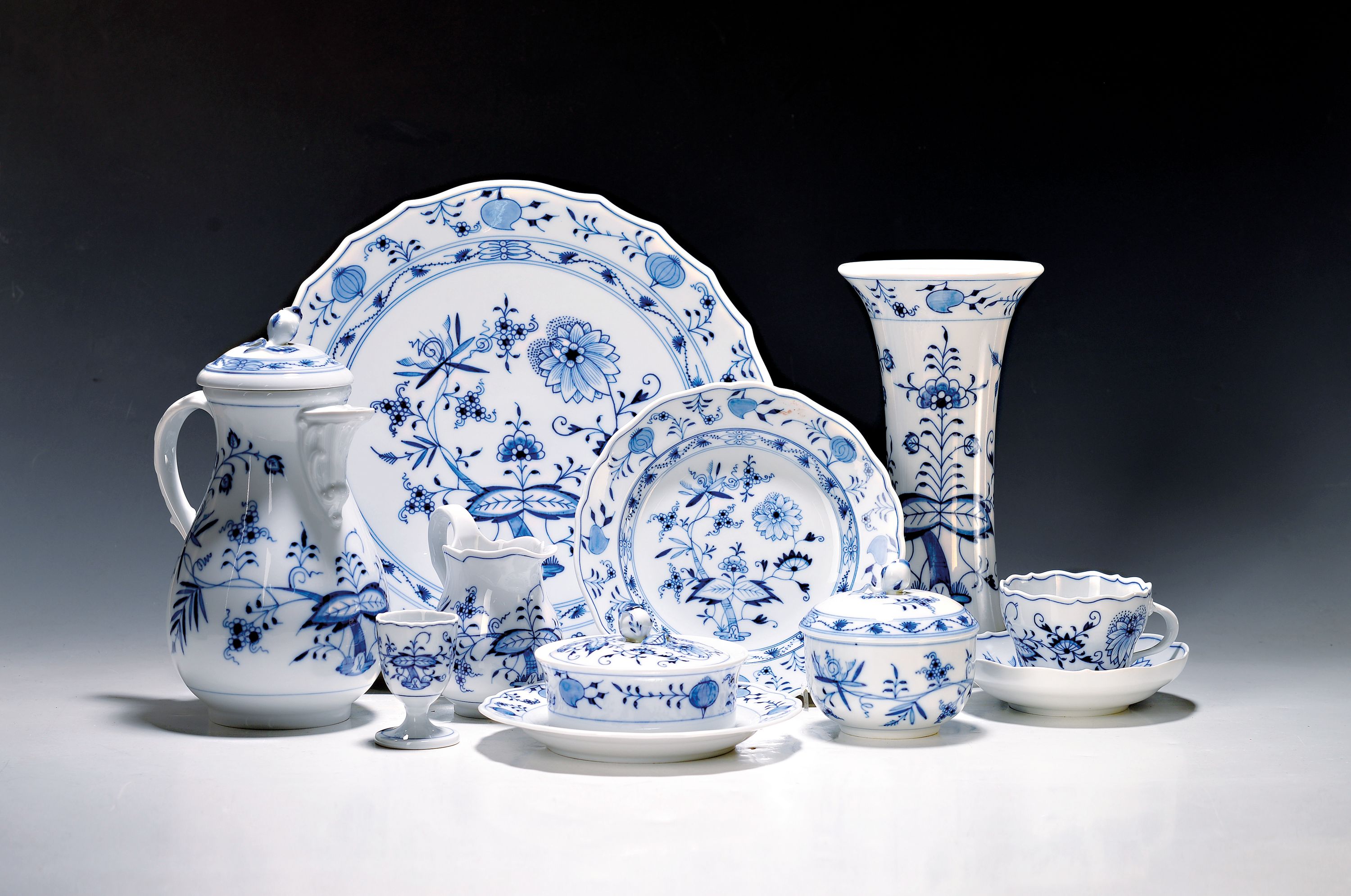 Frühstückservice, Meissen, 20. Jh., blaues Zwiebelmuster unter der Glasur, vorwiegend