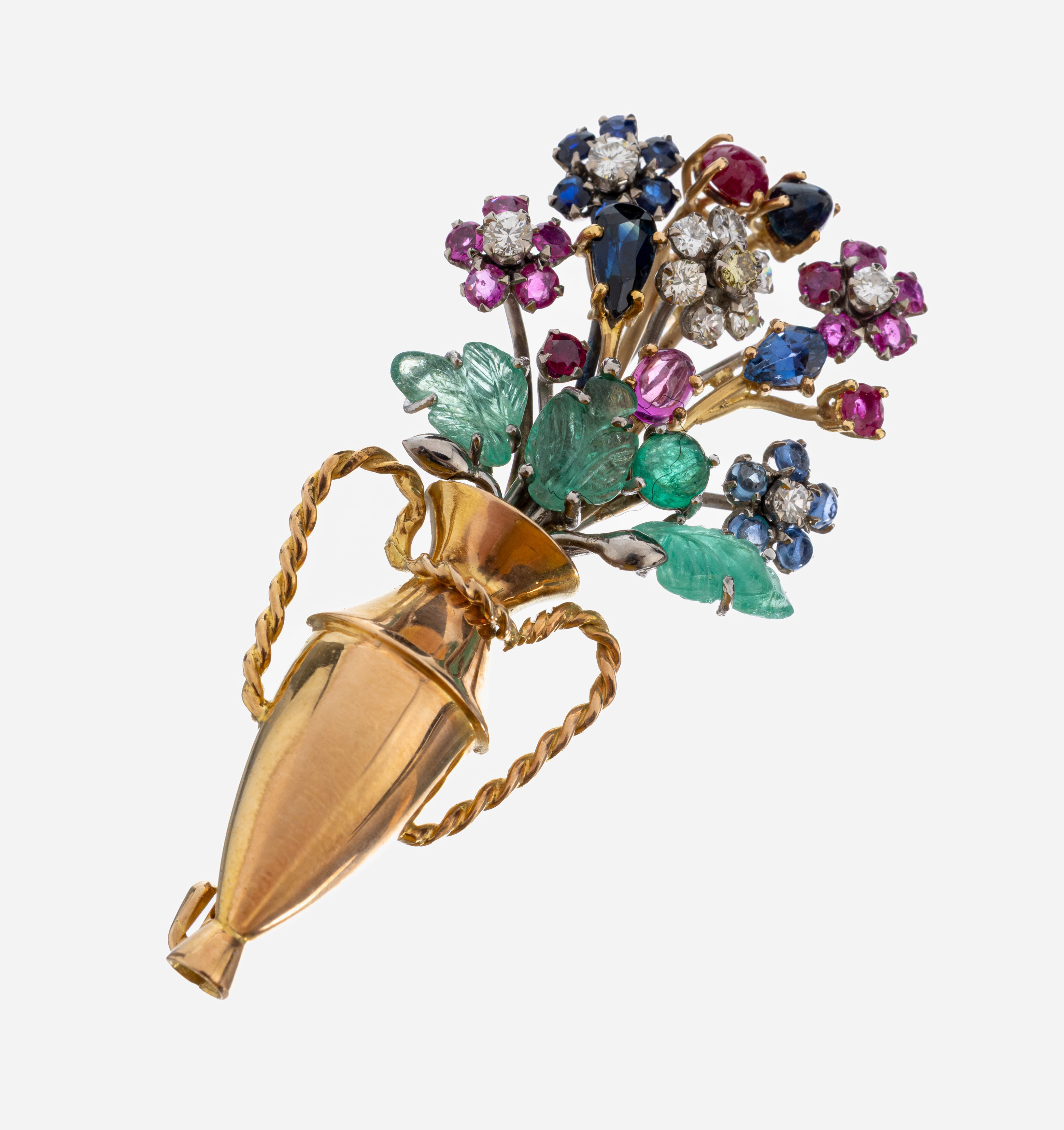 Blumenstraußes mit Amphorenvase, Smaragde, Rubine und Saphire in versch. Schliffformen