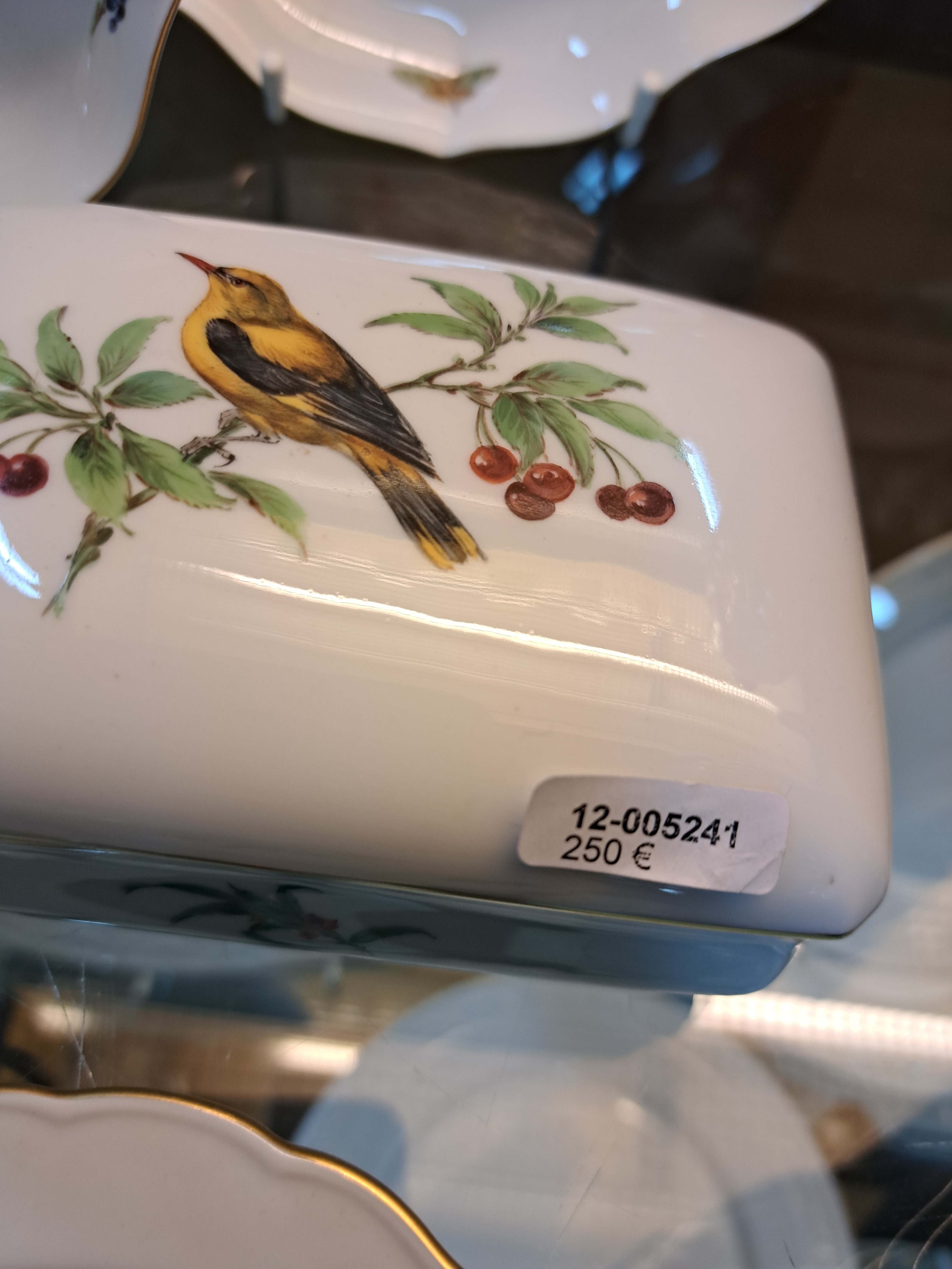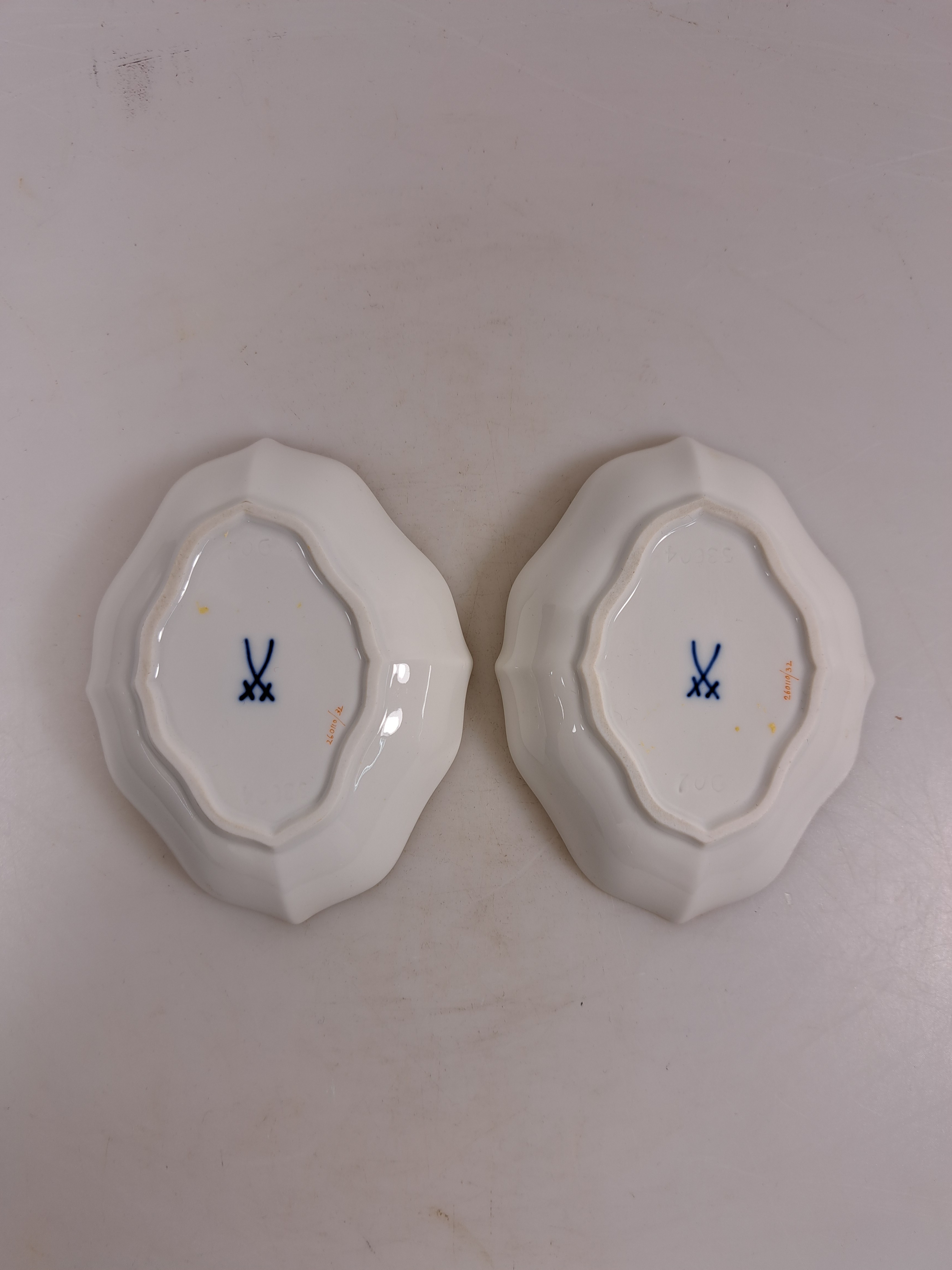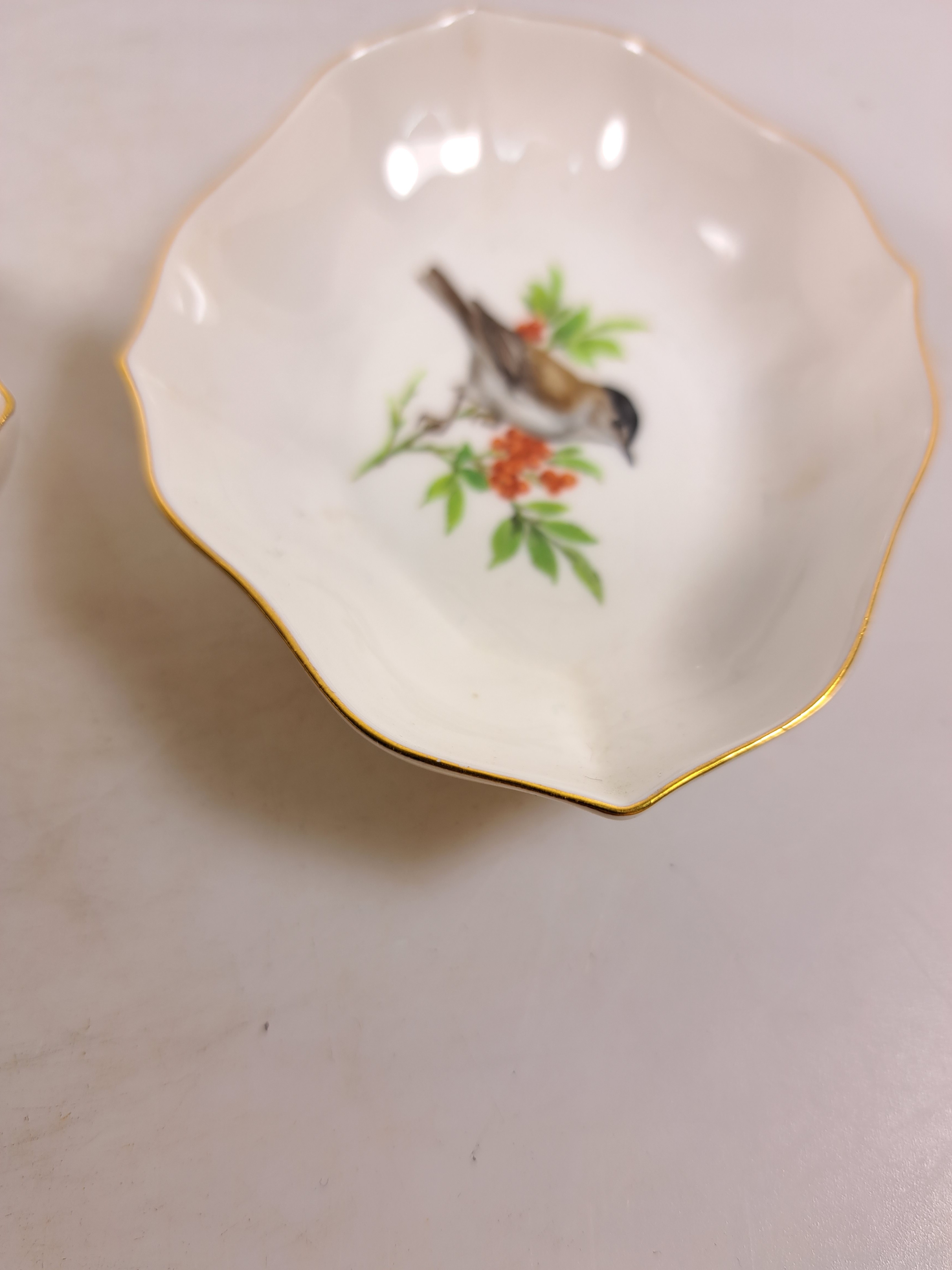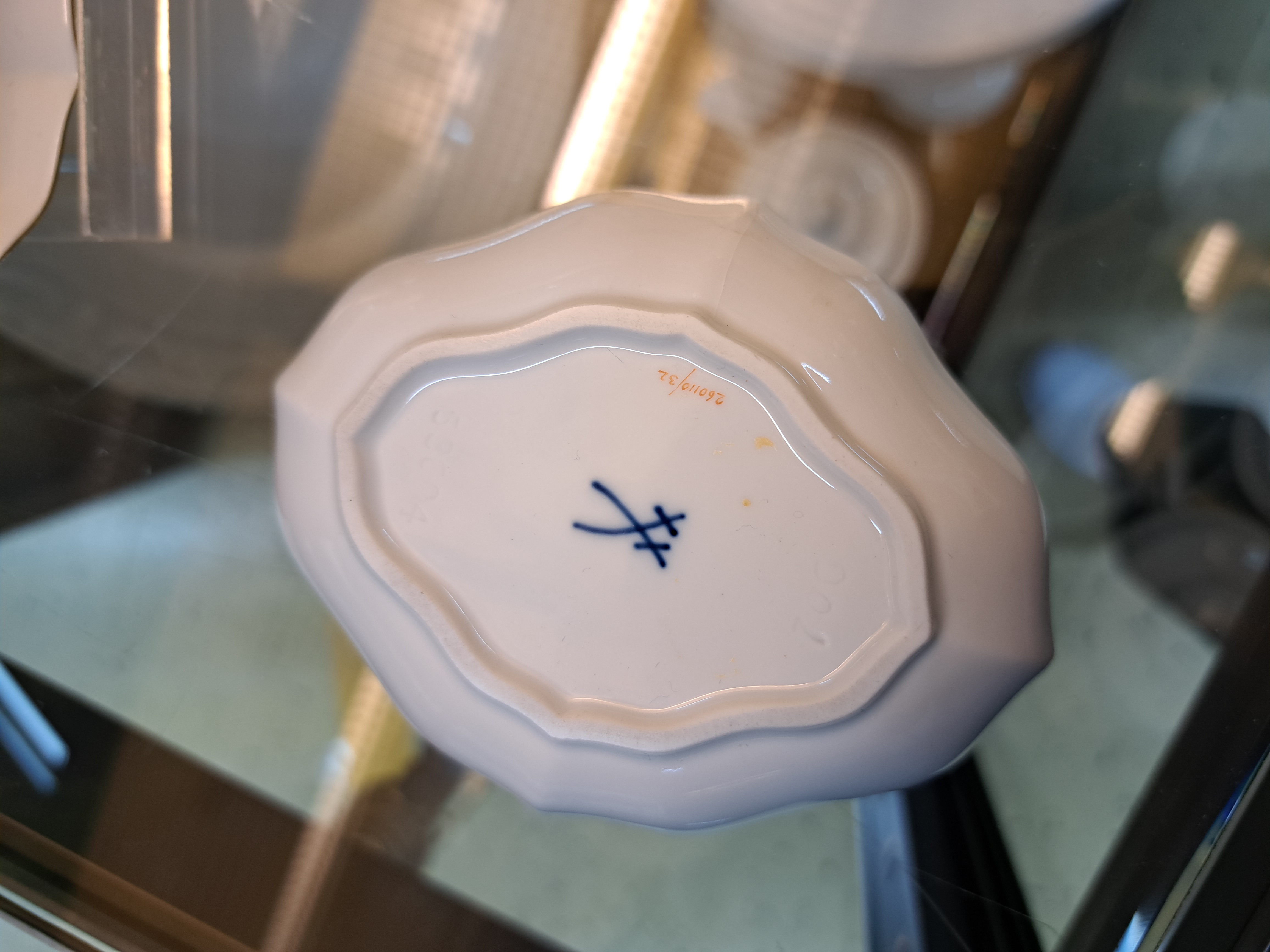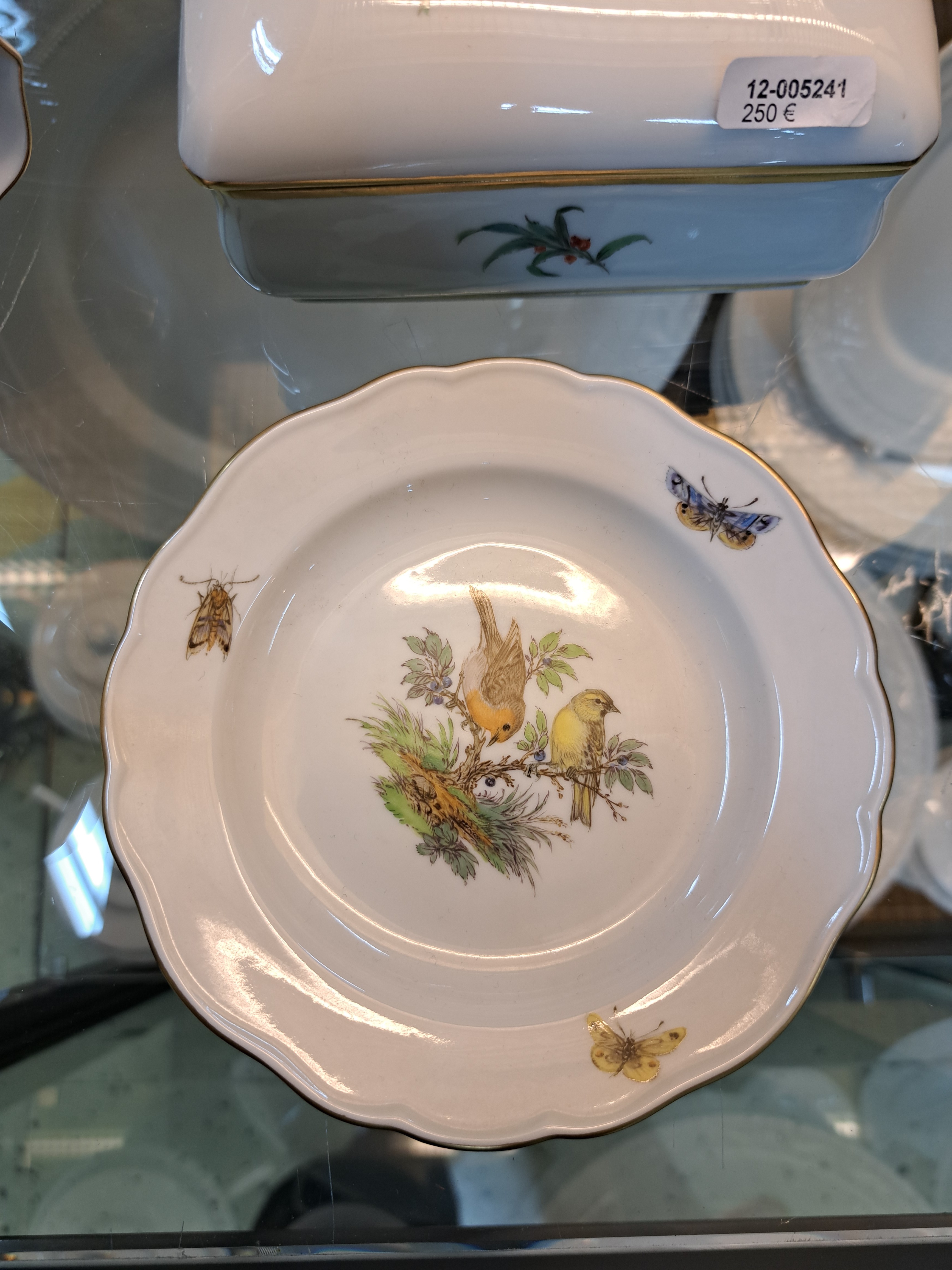| Beschreibung | Deckeldose, Tellerchen und fünf Schalen, Meissen, Vogelmalerei, 20. Jh., Porzellan, Goldränder, Dose: 6.5 x 12.5 x 8 cm, Vierpassschalen 2 x L. 18 cm, 3 x L. 10.5 cm, rundes Tellerchen 13.5 cm |
