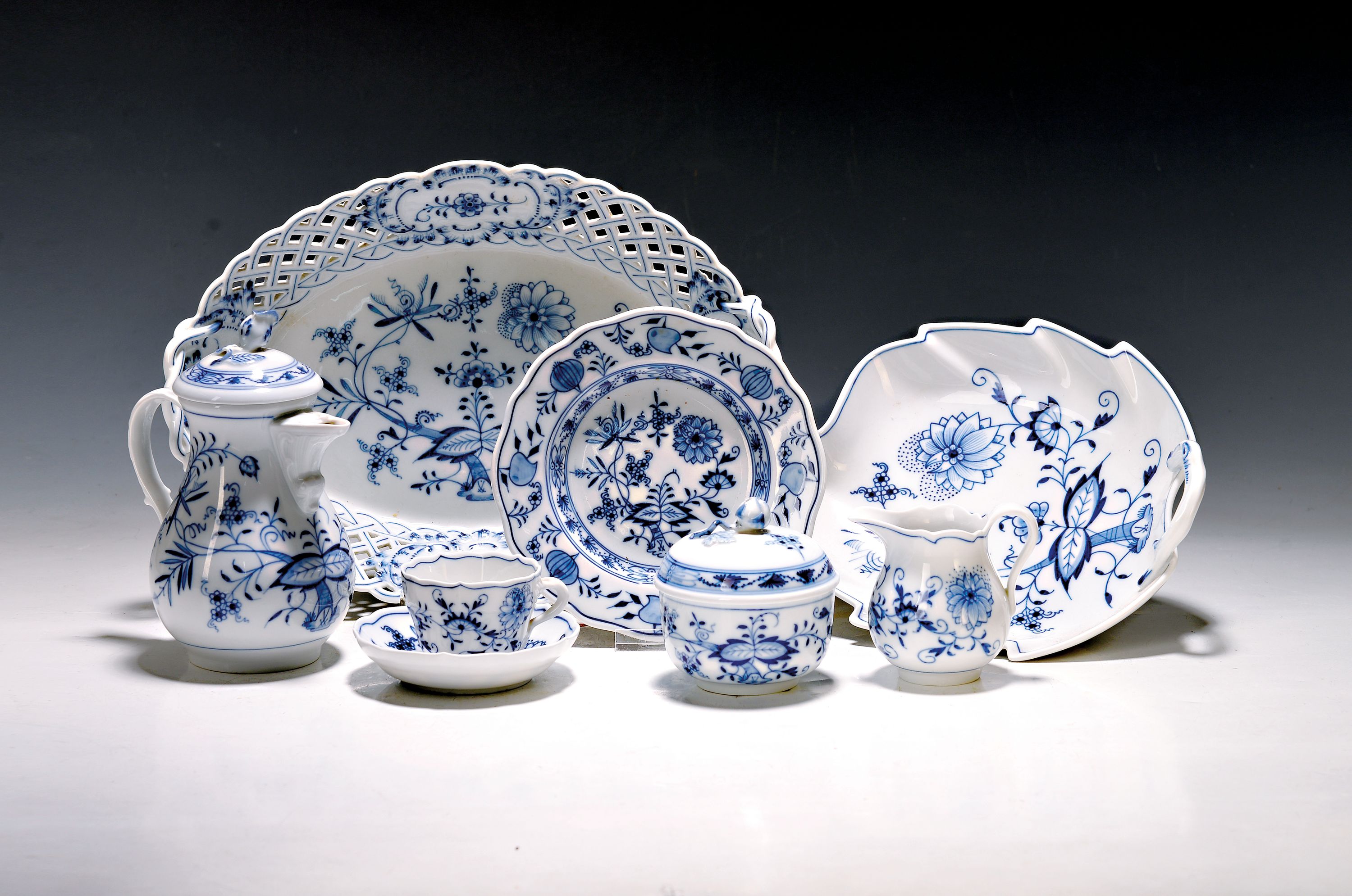 Zwiebelmuster unter der Glasur, Kanne, Sahnegießer, Zuckerdose, 12 Tassen mit Untertassen,