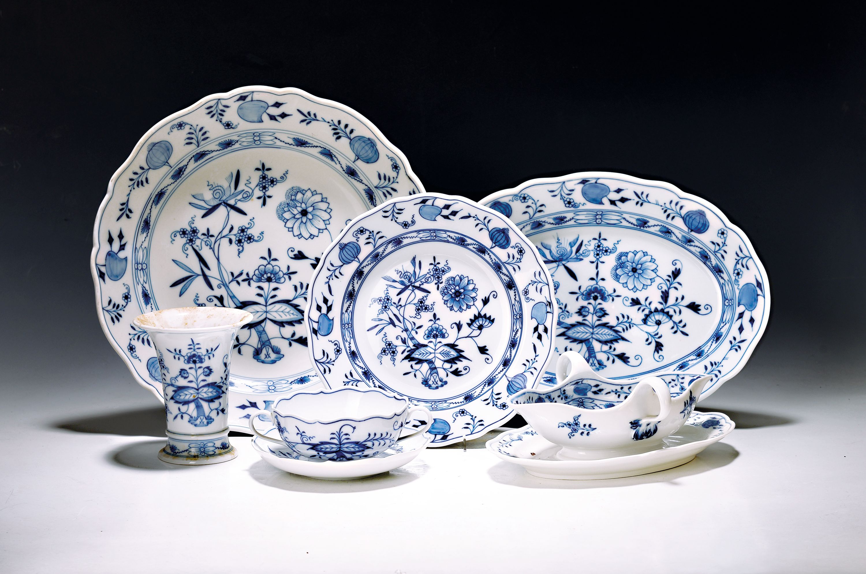 Tafelservice, Meissen, 30er Jahre, Zwiebelmuster, 12 Menueteller, 6 Suppentassen