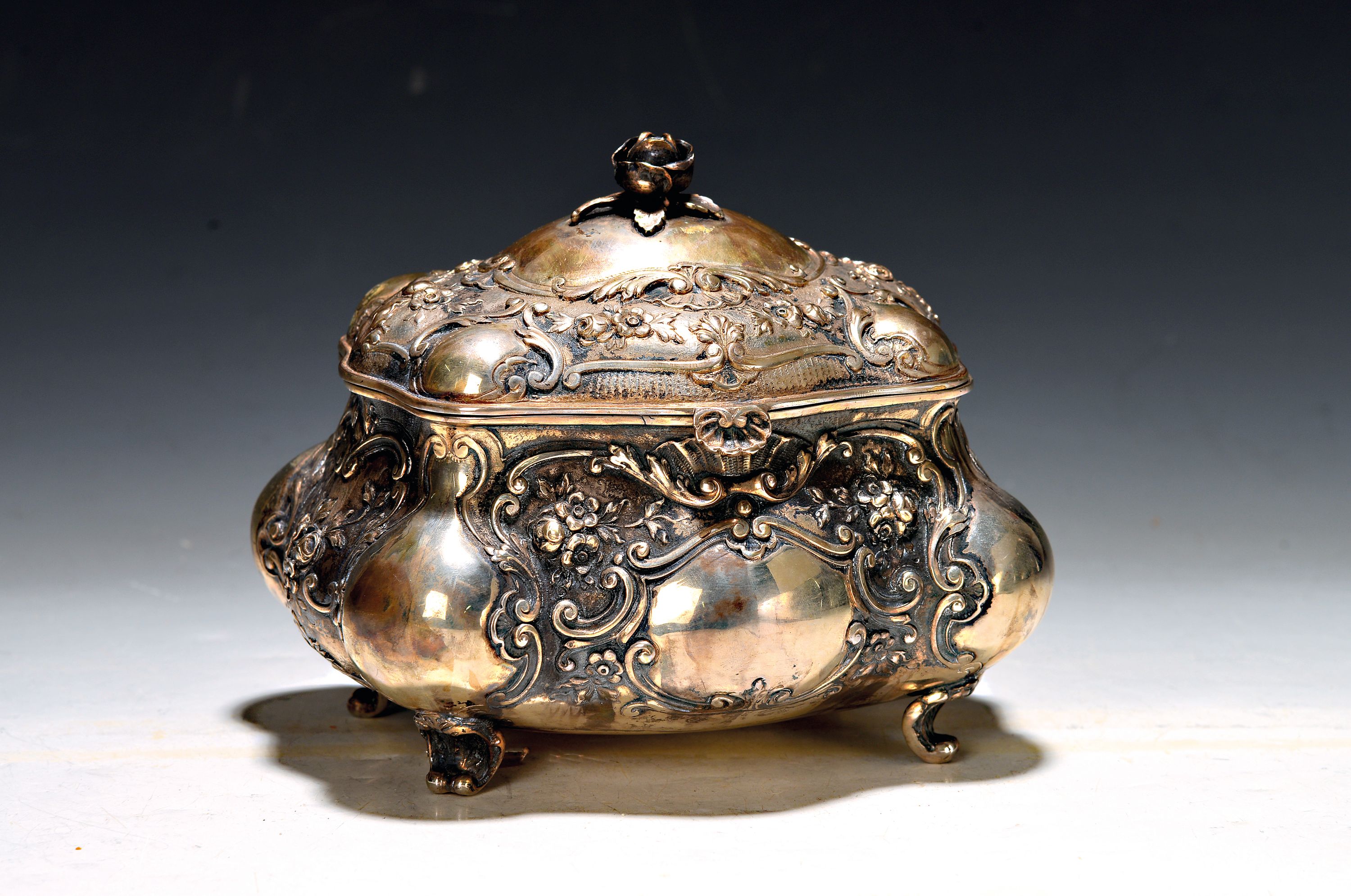 Große silberne Deckeldose im Rokokostil, deutsch, 800er Silber, mit Blumendekor,