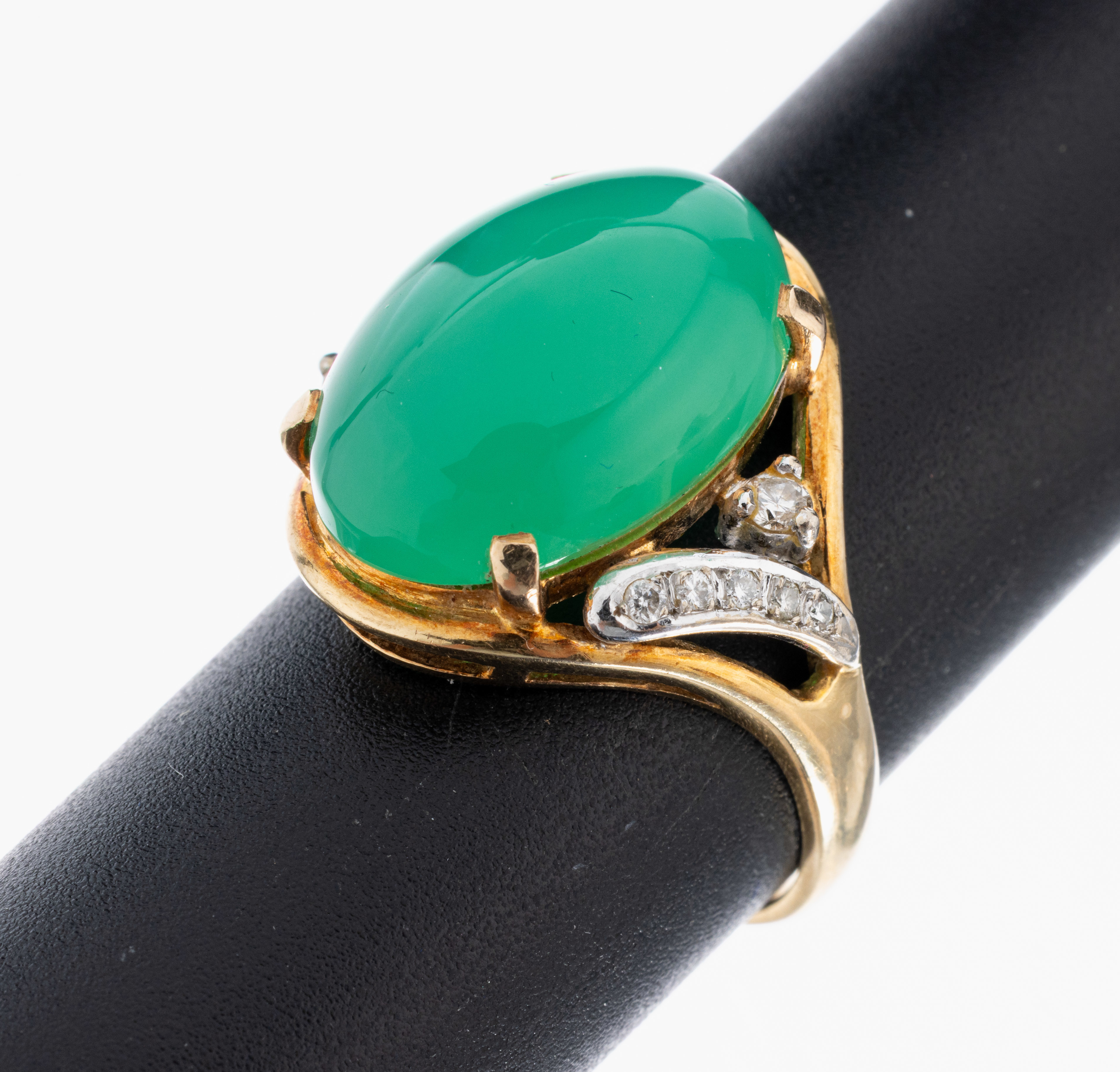 14 kt Gold Chrysopras-Brillant-Ring, GG 585/000, ovaler Chrysopras-Cabochon ca. 12.0