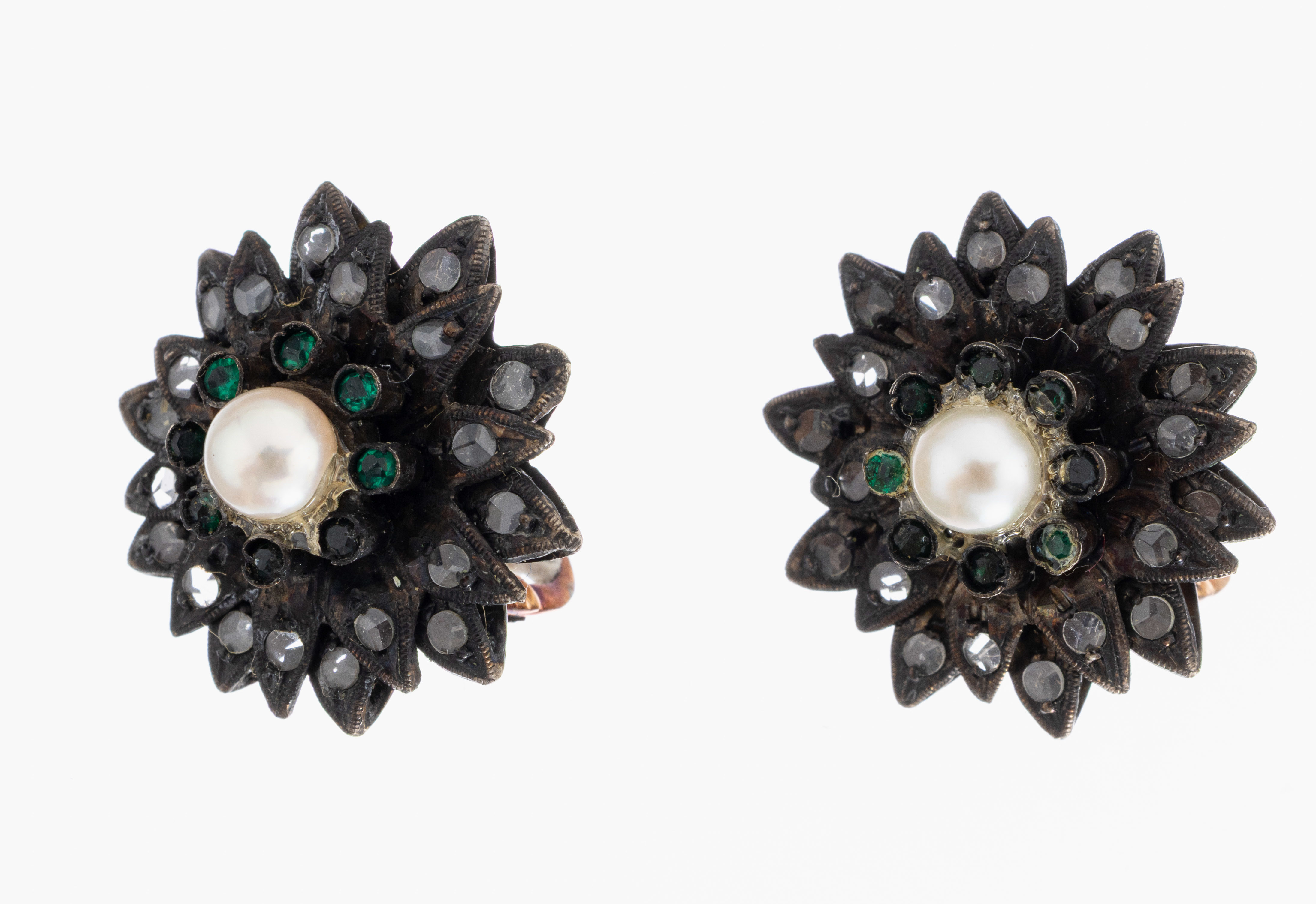 Paar 18 kt Gold Diamant-Smaragd-Perl- Ohrstecker, um 1860, GG 750/000 und Silber,Diamantrosen