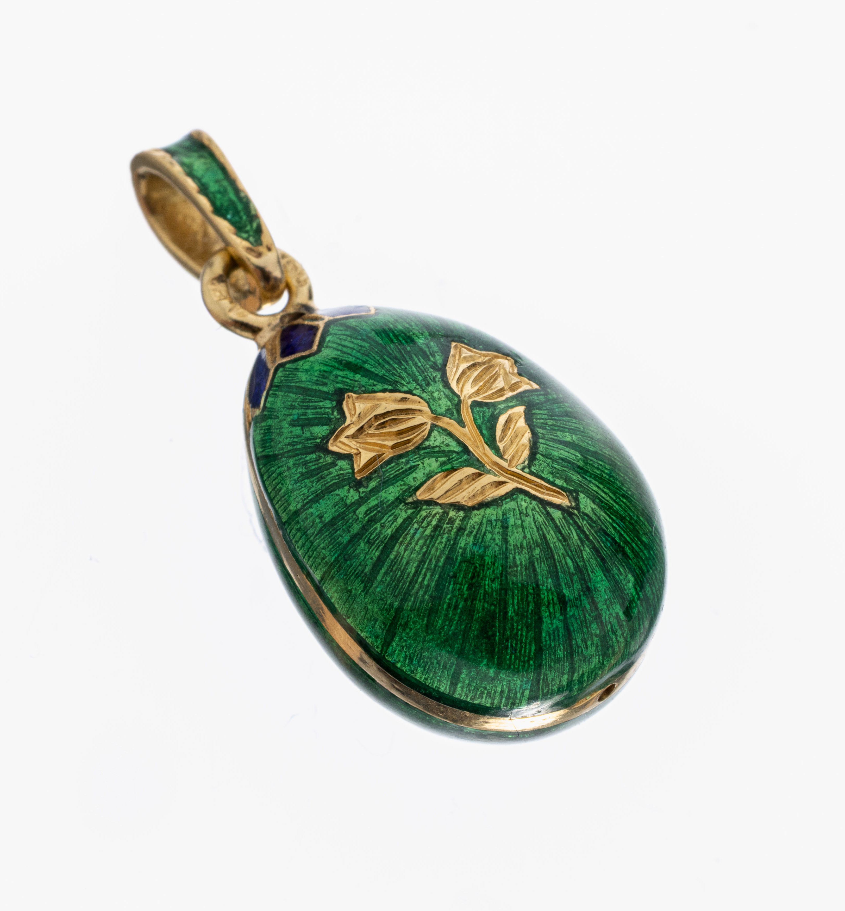 18 kt Gold Anhänger "Ei", GG 750/000, nach Vorbild von Faberge, blaues und grünes