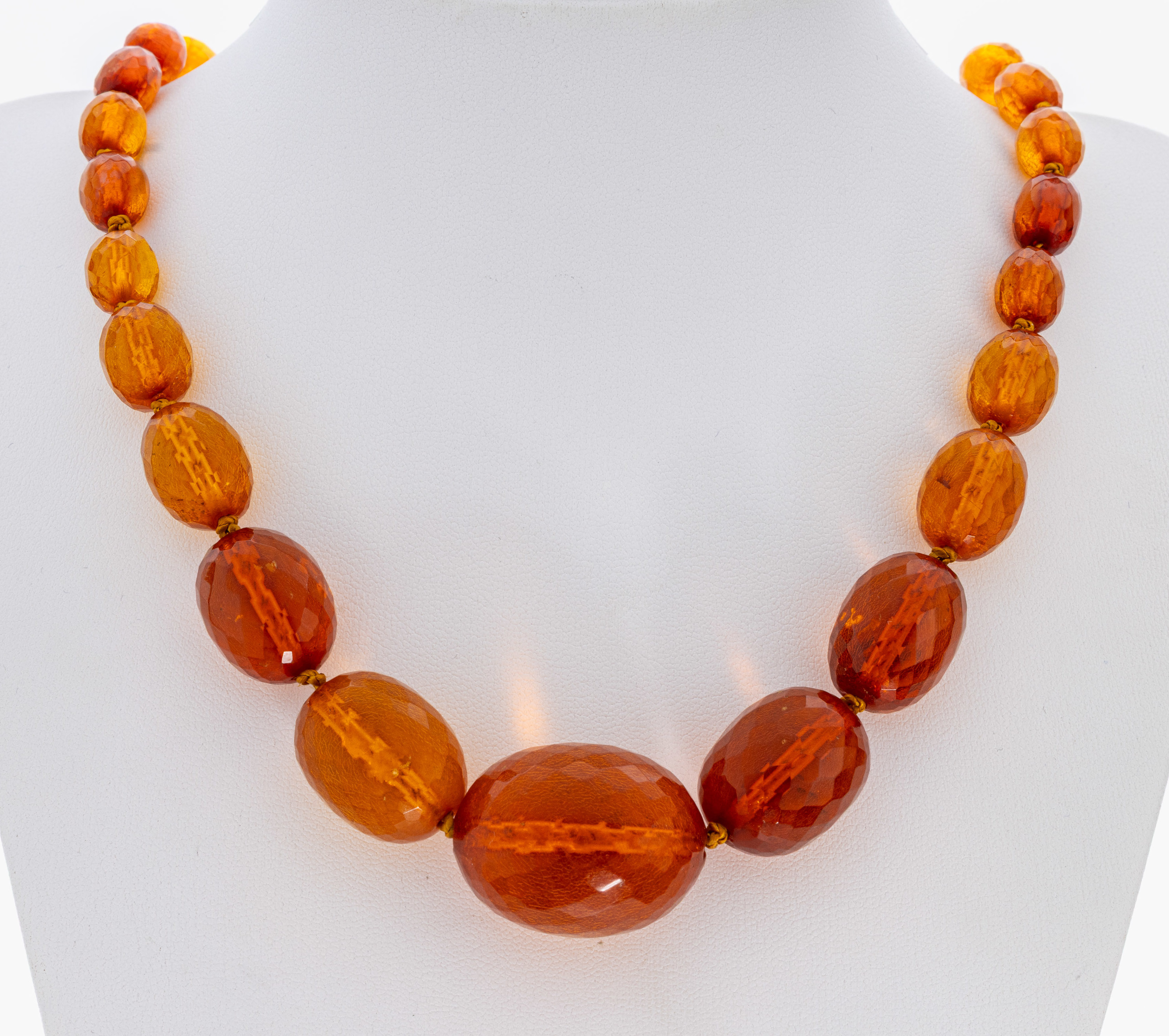 Bernstein-Collier, deutsch, 1930er Jahre, facett. Bernstein-Oliven im Verlauf, D.