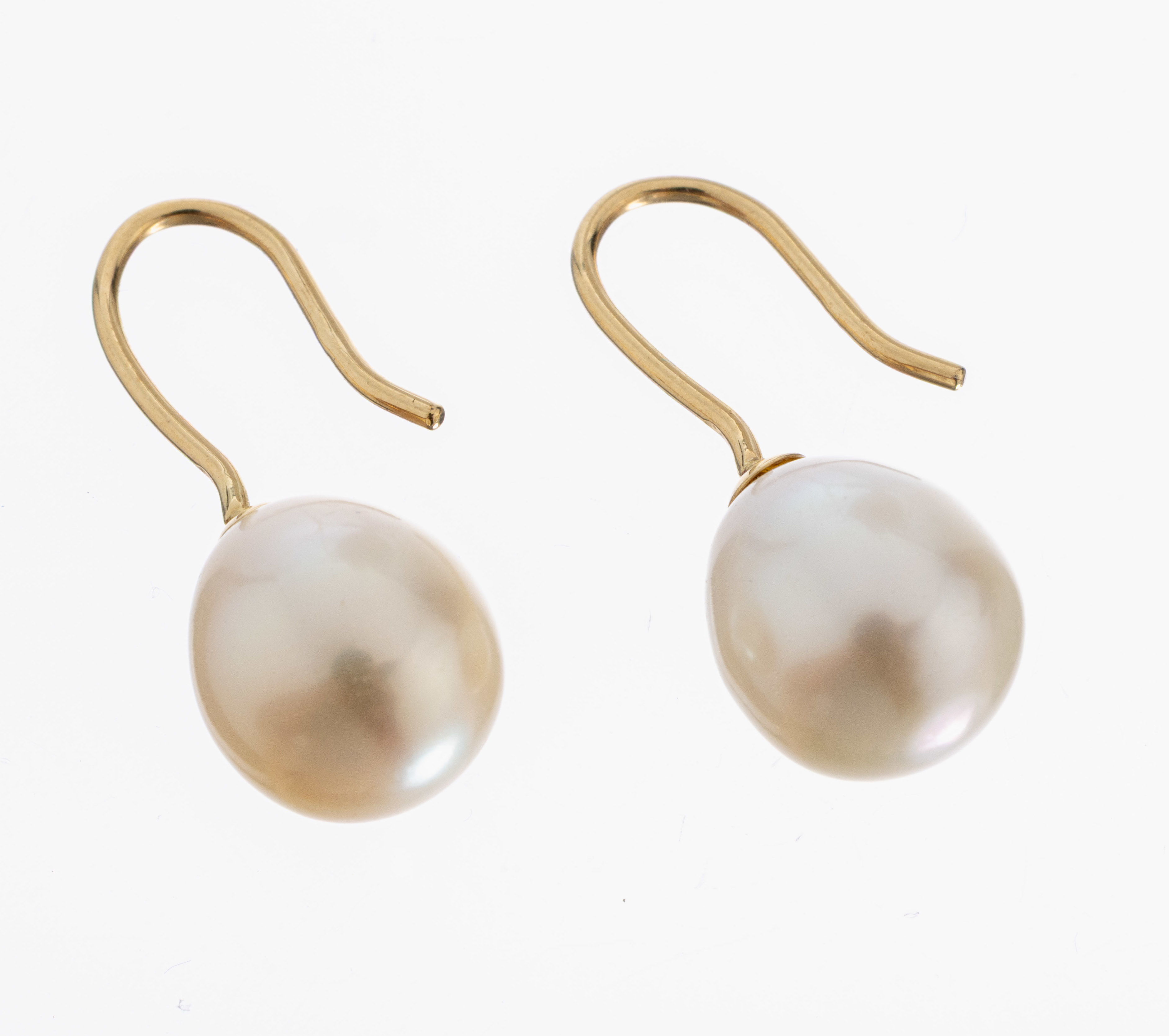 Paar 14 kt Gold Perl-Ohrgehänge, GG 585/000, Perld. ca. 9.1 mm, L. ca. 2 cm