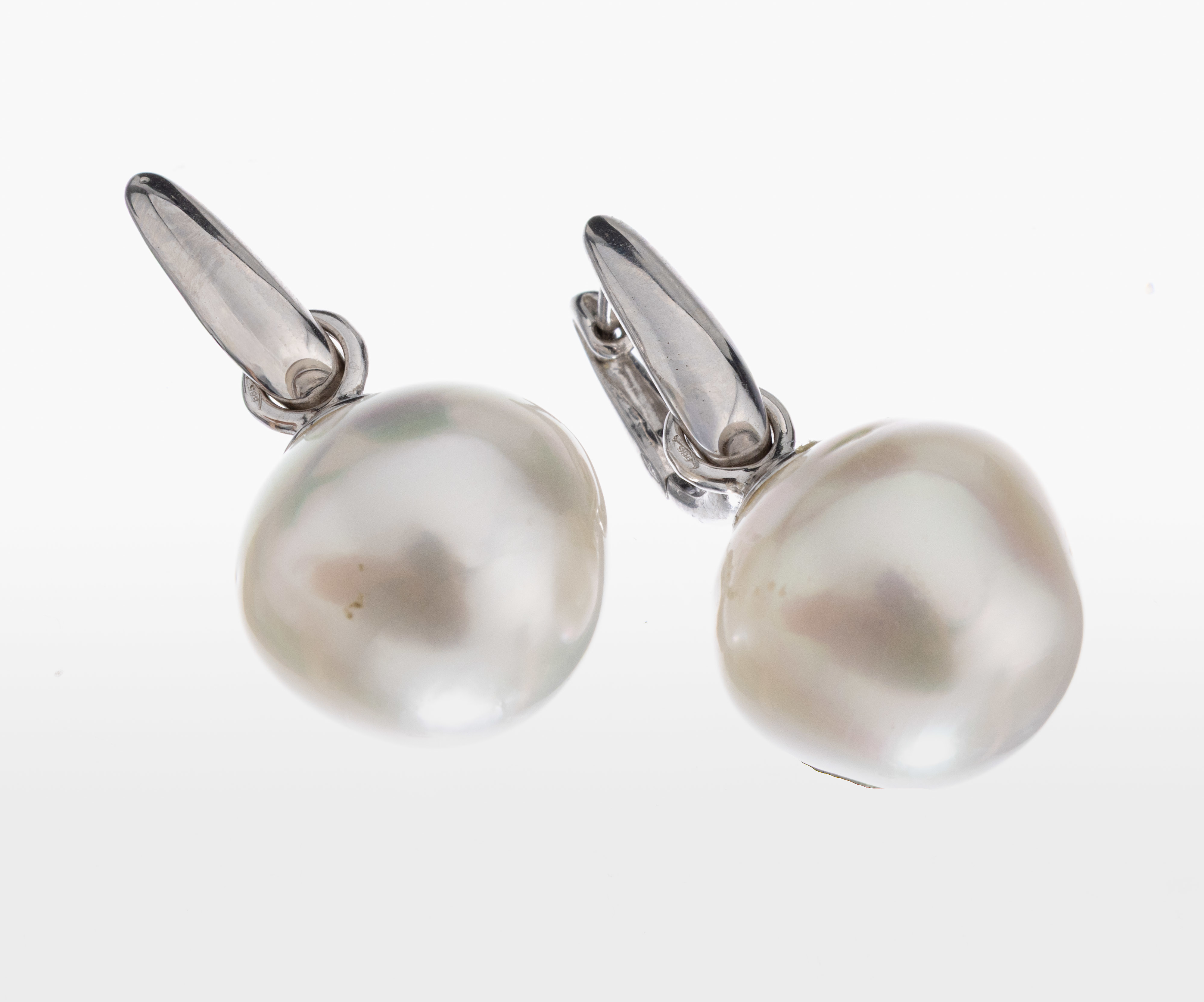 Paar 18 kt Gold Perl-Ohrhänger, WG 750/000,weiße l. unrunde Südseezuchtperlen, D. ca. 14.6 mm, L. ca. 2.3 cm